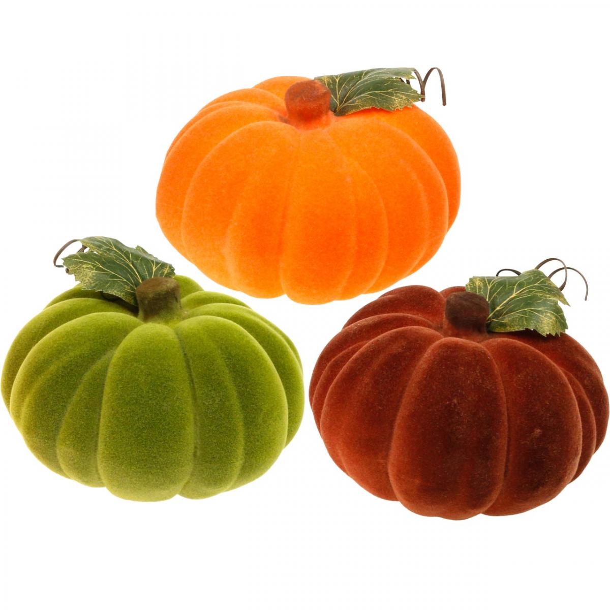 Decorative pumpkin flocked mix orange, green, red autumn decoration 16cm 3 pcs
