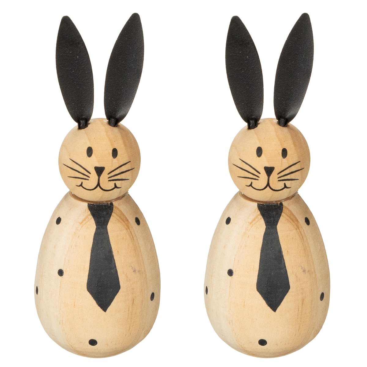 These rabbit figurines impress with their harmonious interplay of materials, colors, and shapes. The rabbits' bodies are made of natural wood in a warm, light color, adorned with small, subtle dots. The matte black metal ears and the playful tie complete the design with a touch of modern flair. Their handy size of 12 cm in height and 4.5 cm in diameter makes them ideal for a variety of decorations. Whether displayed as a group in Easter decorations or as a single statement piece on a windowsill, these rabbits lend a charming character to any arrangement.