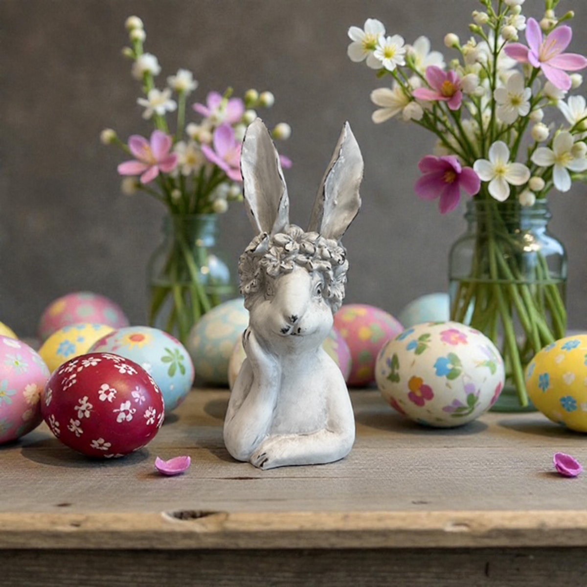 Our decorative rabbit impresses with its harmonious interplay of understated elegance and delicate detailing. The expressive pose with its supporting hand and the playful floral wreath on its head give this figure a unique personality. The pleasing gray color makes it versatile, while its high-quality ceramic material ensures stability and durability. It is suitable for both indoor and covered outdoor areas.