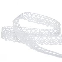 The lace decorative ribbon in Flower is available with a width of about 16 millimeters and a length of about 20 meters on a flat plastic spool to which it is attached with a needle.