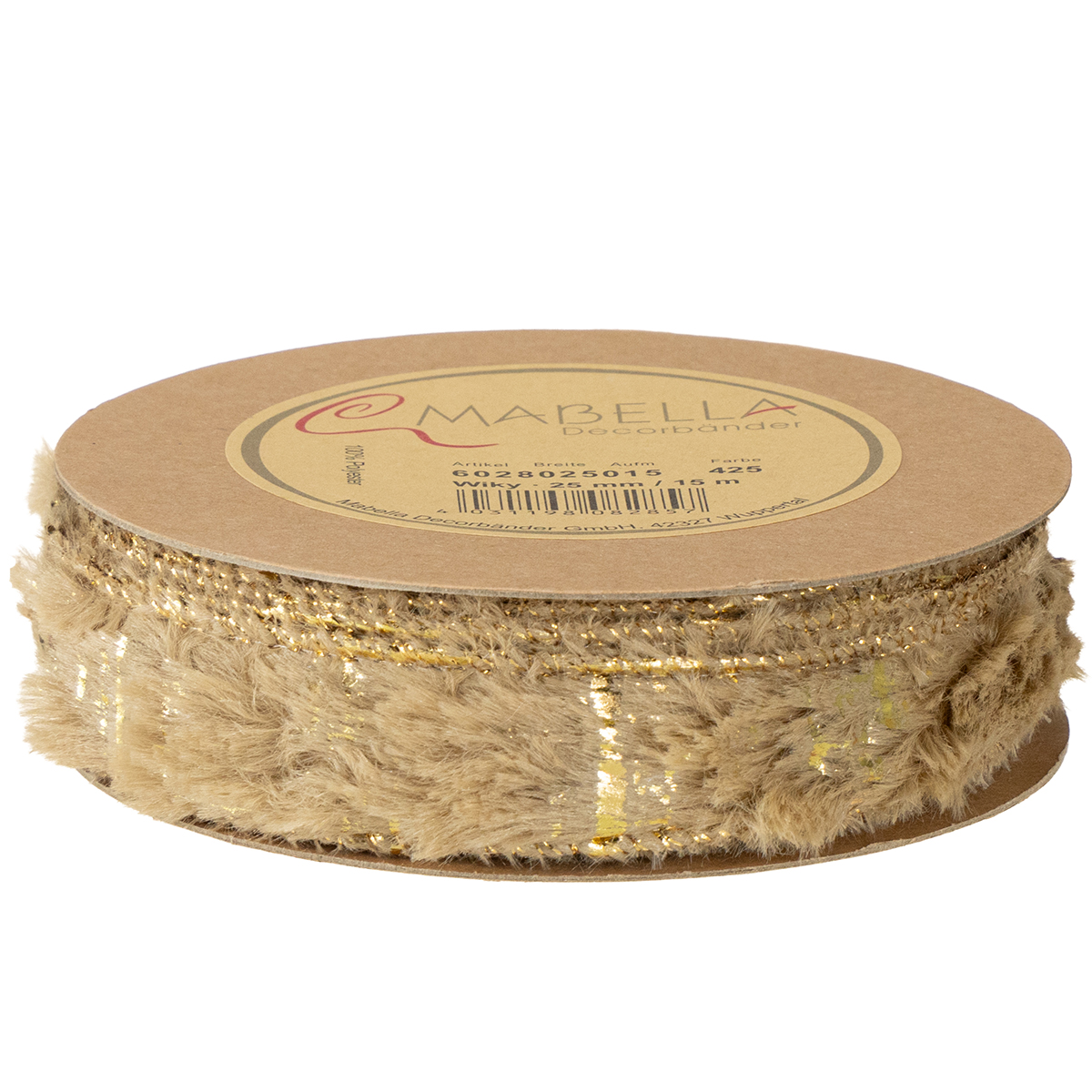 Decorative ribbon with fur, faux fur ribbon, brown gold, 25mm, 15m
