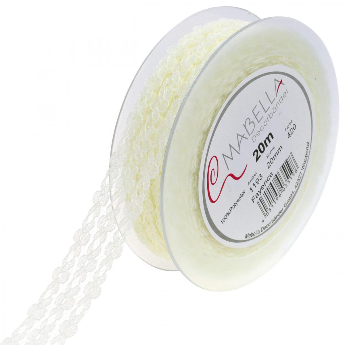 The lace ribbon in vanilla is made of 100% high-quality polyester, is around 20 millimeters wide and around 20 meters long. You receive the yellow deco ribbon practically rolled up on a flat plastic spool.