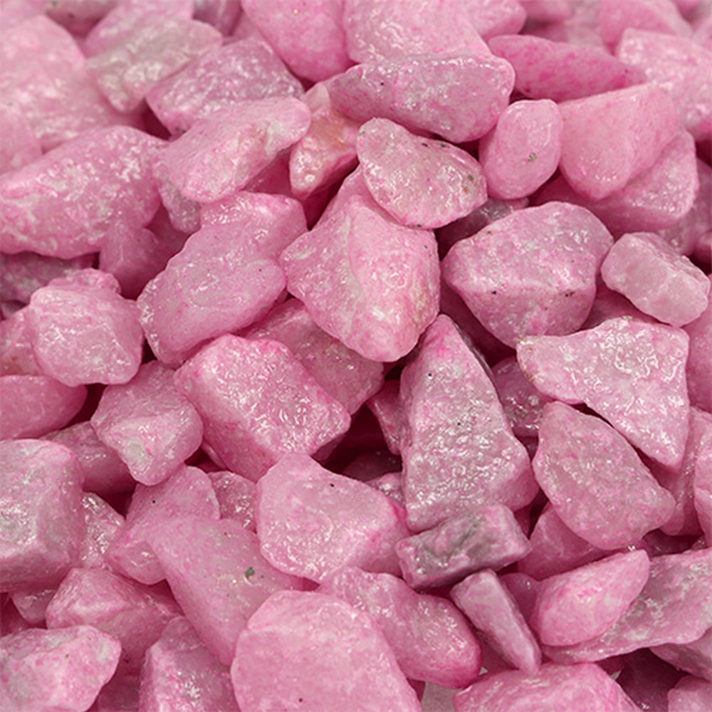 The decorative stones are colored pink and come in a bag with a total weight of around 2 kilograms. The size ranges from about 9 to 13 millimeters.