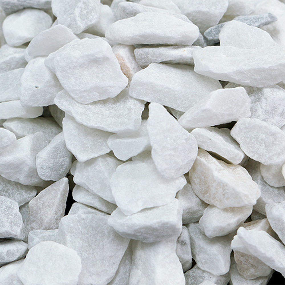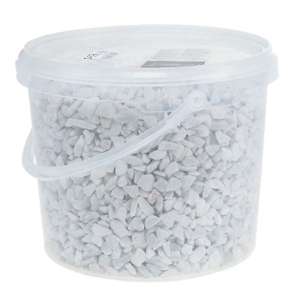 The white decorative stones are delivered in a bucket of 5 liters. Each of the real stones is approximately between 9 and 13 millimeters long.