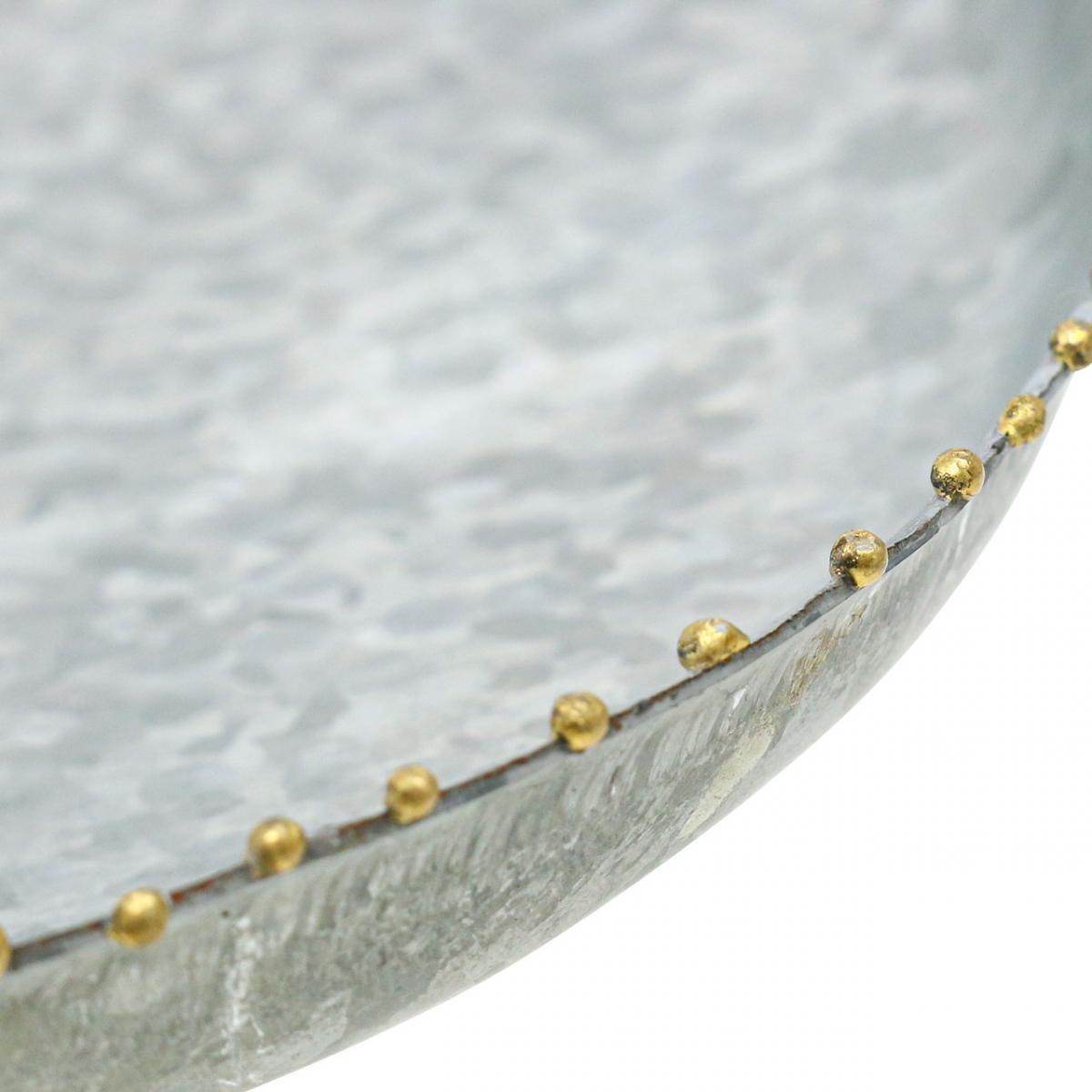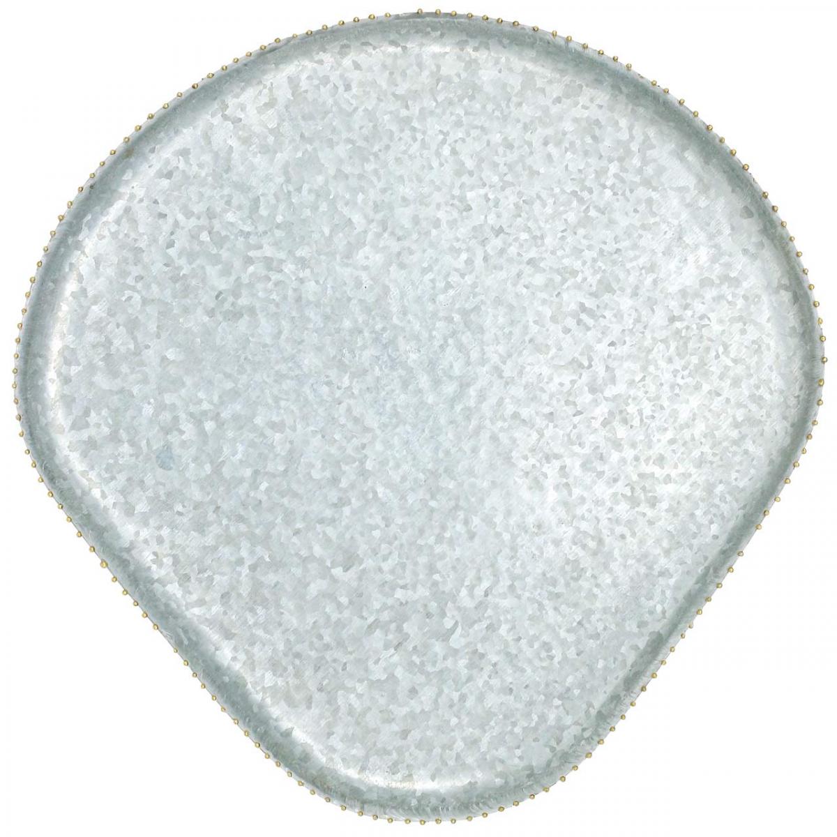 Bulbous in shape and tapering in design, the zinc tray resembles an oversized drop. The white-washed decorative tray with the typical antique finish is decorated with small golden pearls on the edge.