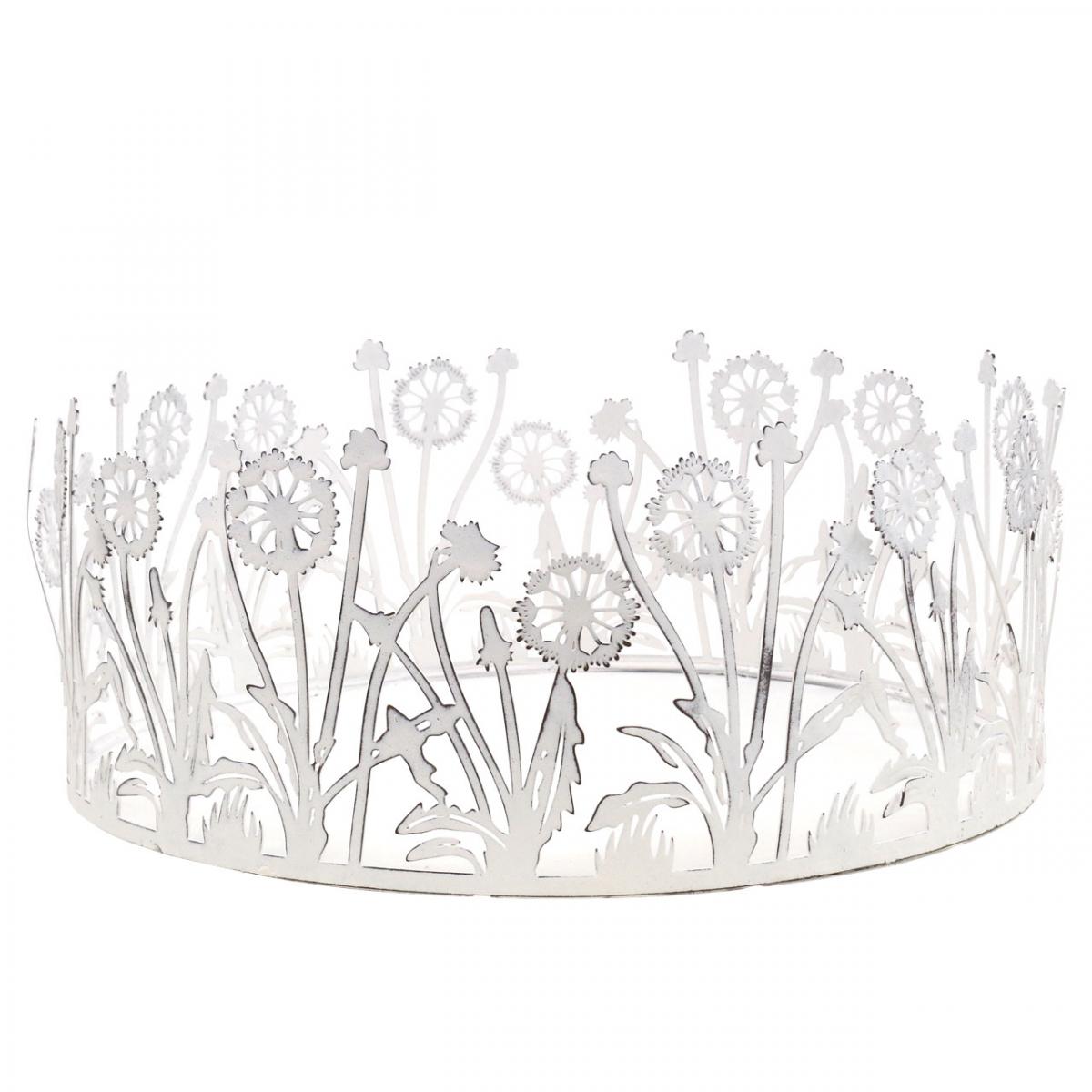 Decorative tray with dandelions, metal decoration for spring white, silver shabby chic Ø25cm H10.5cm