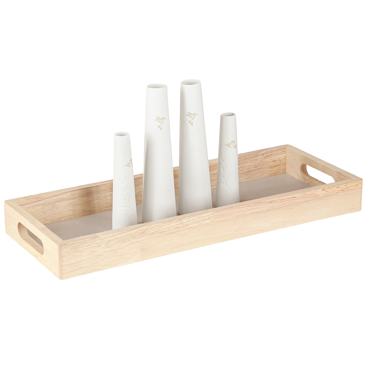 Discover the decorative wooden tray with four mini vases made of white ceramic - the perfect fusion of nature and contemporary design. This artistic decorative tray impresses with its rustic charm and the delicately designed mini vases, which are made of fine white ceramic and are highlighted by a small golden bird reminiscent of a hummingbird. The elegant combination of wood and ceramic fits seamlessly into any table decoration for spring or summer and expands a variety of styles, from Scandinavian to modern to country house. Use this exquisite wooden decoration with vases as a highlight on your festive table or as a stylish addition to your living room decoration. Together with matching accessories such as the diverse creative ideas that you can find at Floristik24, you can create a harmonious ambience in no time at all.