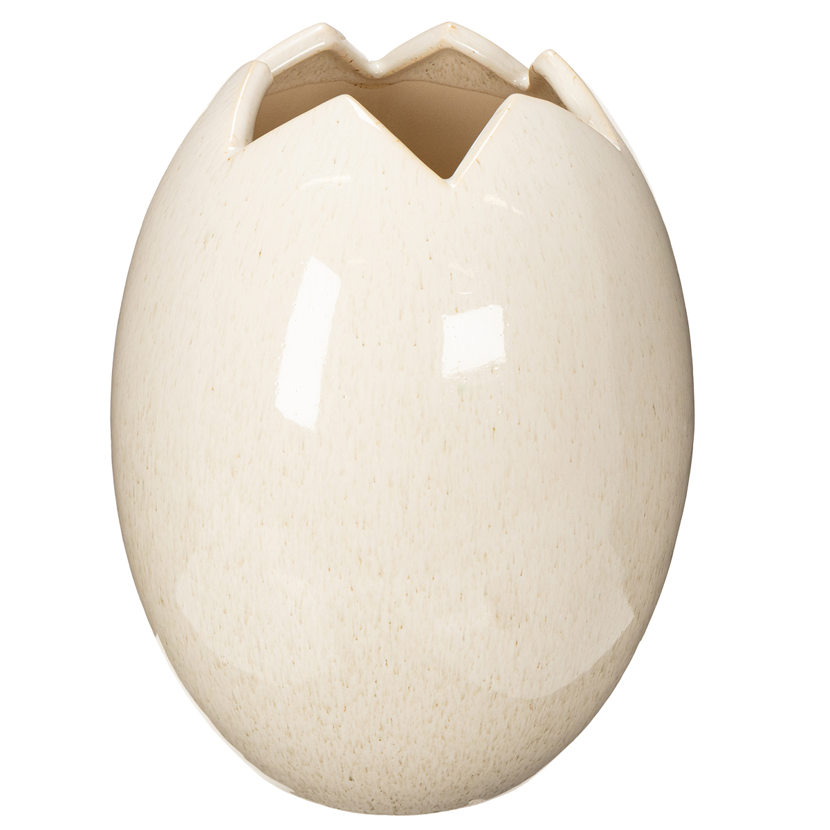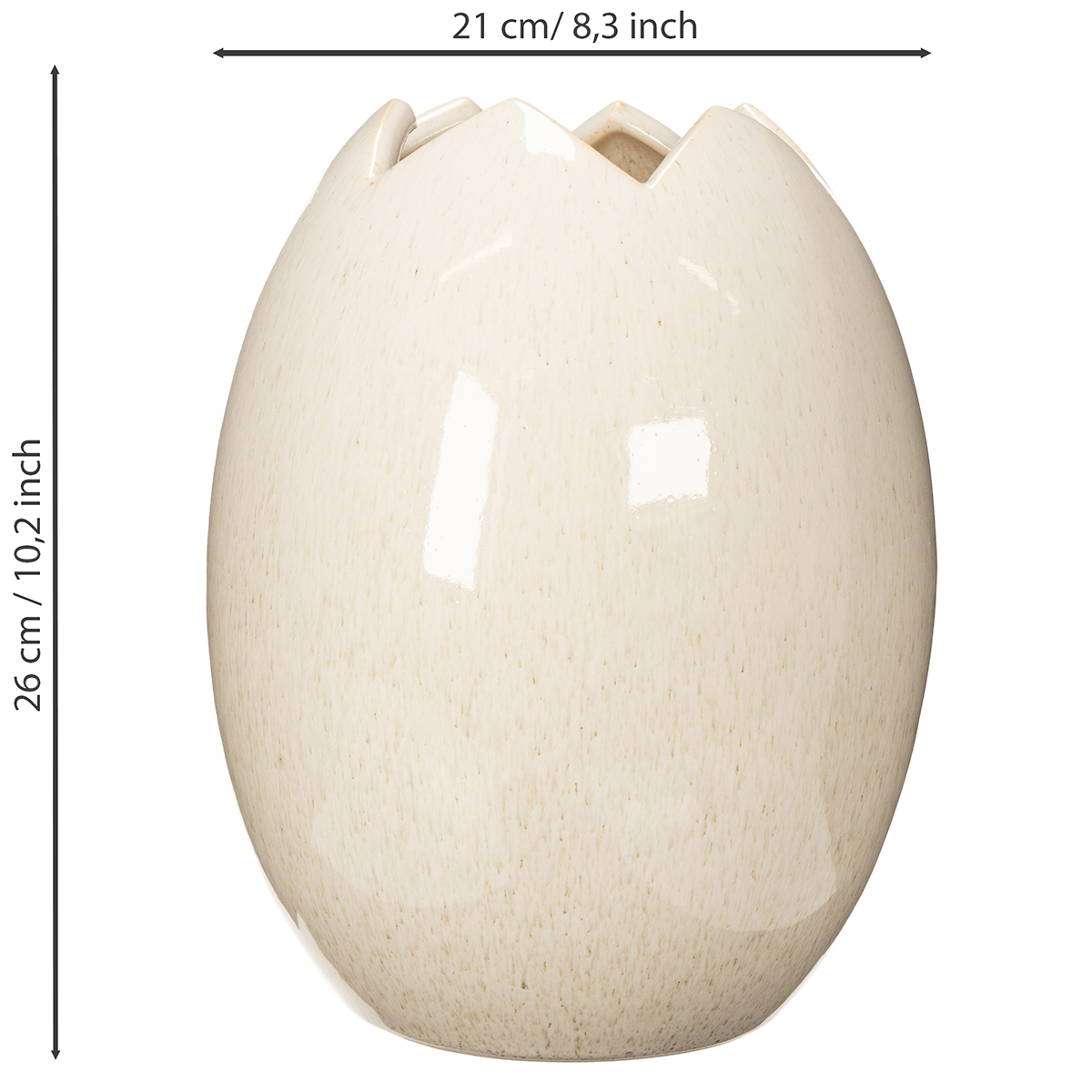 This egg-shaped decorative vase combines modern design with versatile functionality. With its dimensions (26 cm high, 21 cm in diameter) and high-quality ceramic material, it blends seamlessly into various living spaces. Its chic speckled white finish exudes understated elegance that is never obtrusive. The cracked "eggshell" effect at the top edge makes it a real eye-catcher.