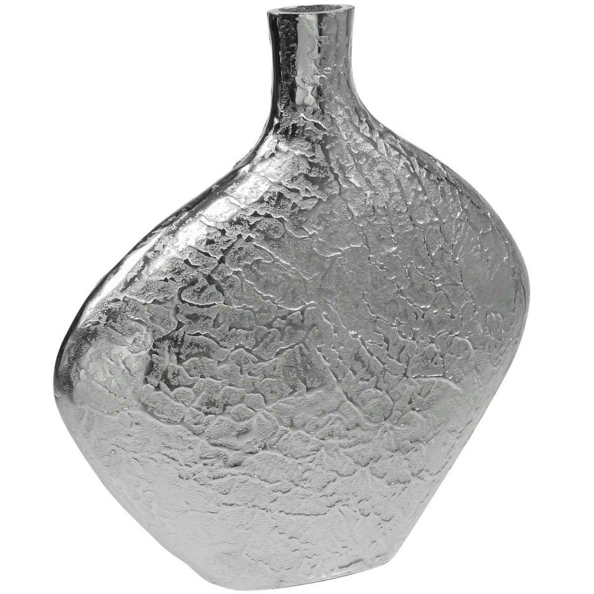This metal decorative vase has an elegant and elegant design. The flower vase in silver is reminiscent of a flattened bottle shape.