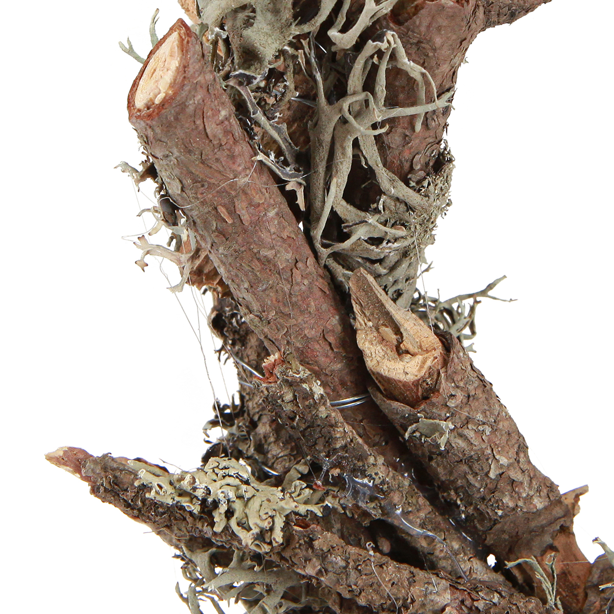 The decorative wreath with branches and bark has an outside diameter of about 40 centimeters and an inside diameter of about 20 centimeters, whereby it is about 7 centimeters high.