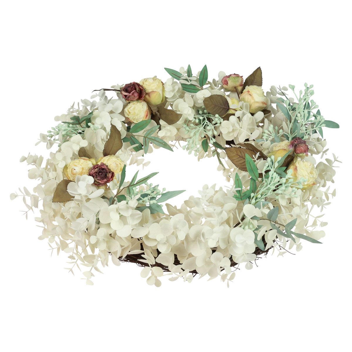 The wreath with eucalyptus and artificial roses has a total diameter of approximately 50 centimeters. – You can also find other artificial wreaths in other designs as well as wreaths with preserved eucalyptus leaves in our large range!