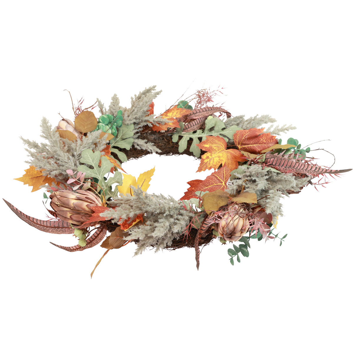 The wreath with autumn leaves and artificial protea has a total diameter of around 55 centimeters. – In our large range you will find many other beautiful wreaths made of artificial plants for hanging or as table decorations.