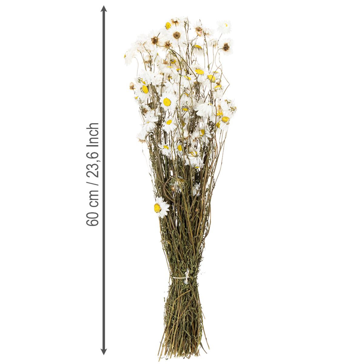 The Acroclinium, with its white blossoms, looks like picture-perfect dried flowers. These flowers were carefully selected for trendy dried flower arrangements, gently dried to preserve their color, and arranged in a bundle. This natural product requires no watering and, thanks to its longevity, is a particularly sustainable floral decoration.