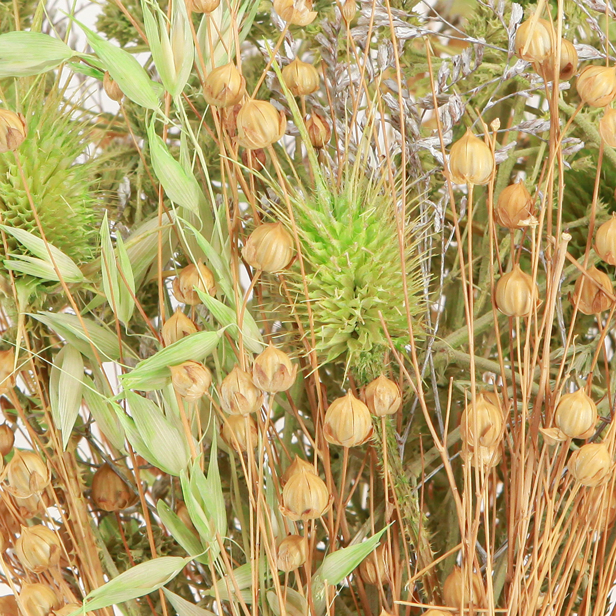 Our dried flower bouquet for the home is more than just a decoration: it is a statement of natural elegance and sustainable aesthetics. The combination of oats and wild teasel in mint and natural-colored flax blends harmoniously into any room. A soft, friendly color palette makes this decorative bouquet with dried flax the perfect accessory for wood and natural materials as well as ceramic vases.
