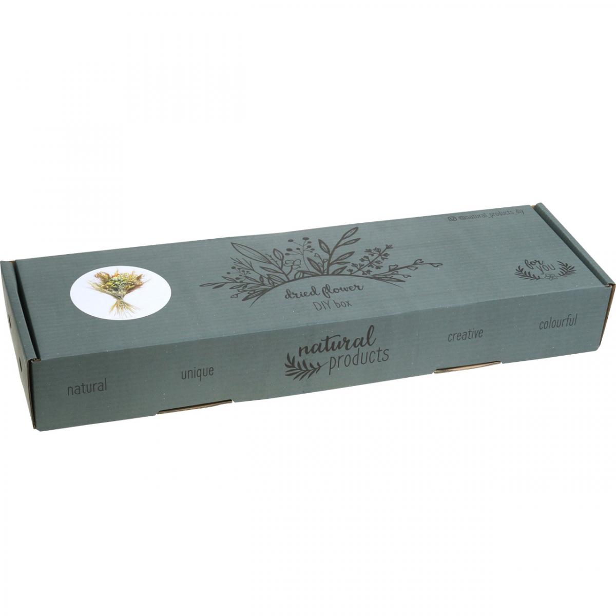 The dried flower DIY set in yellow and natural colors is safely delivered in a resealable, sturdy cardboard box.
