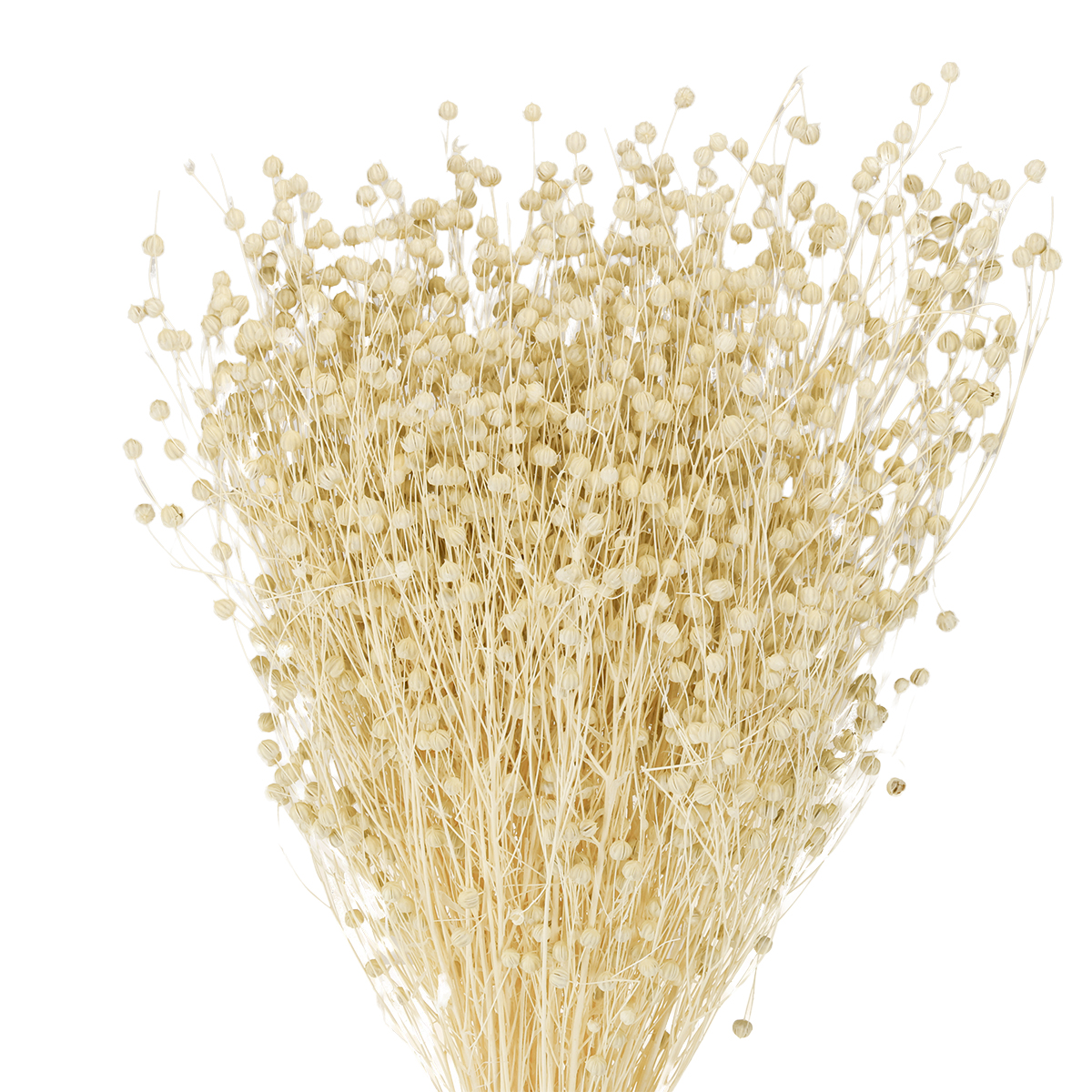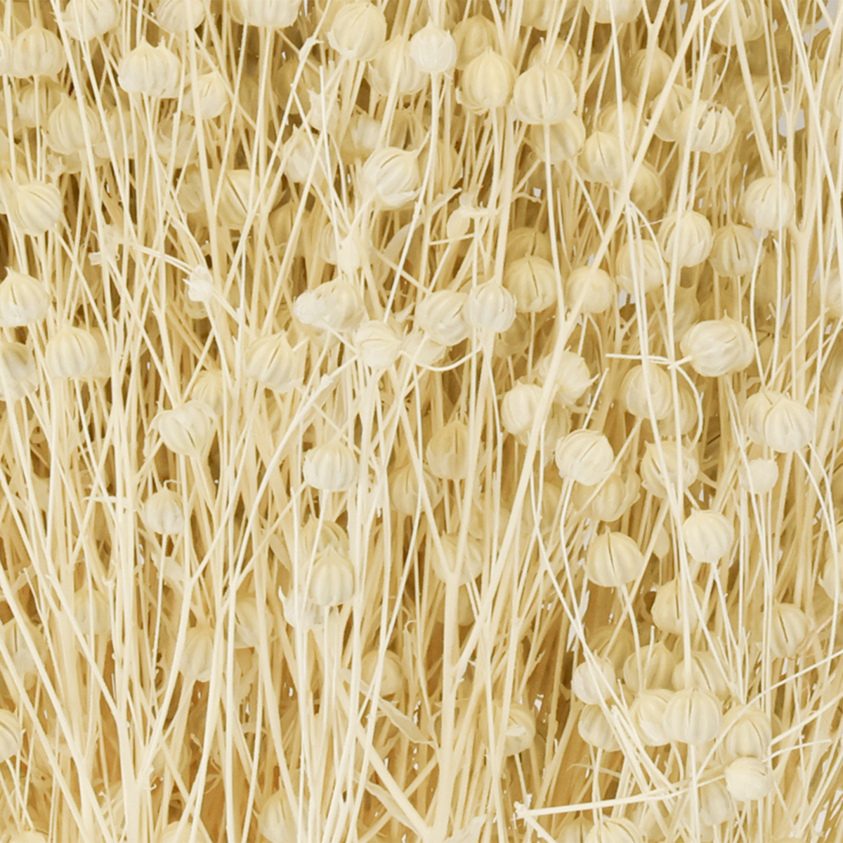 The flax is naturally colored, slightly bleached, and therefore matches the color of many other dried grasses, such as bushy pampas grass, reeds, or dried thistle. The dried flax, with its round seed capsules, stands out visually from the ensemble of dried flowers.