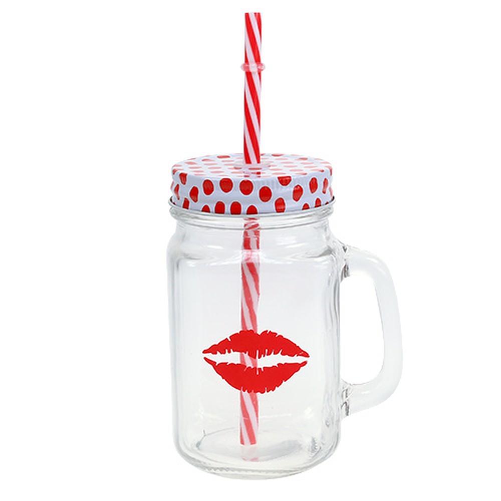 The square drinking glass is printed with a red kissable mouth and has a dotted sheet metal lid that can be screwed on with a hole through which the supplied drinking straw can be inserted. This is made of sturdy plastic and is approximately 19 centimeters long. The glass itself has a height of about 13.5 centimeters and an opening diameter of about 7 centimeters and is about 7 centimeters wide. Please note that the drinking cup is not dishwasher safe .