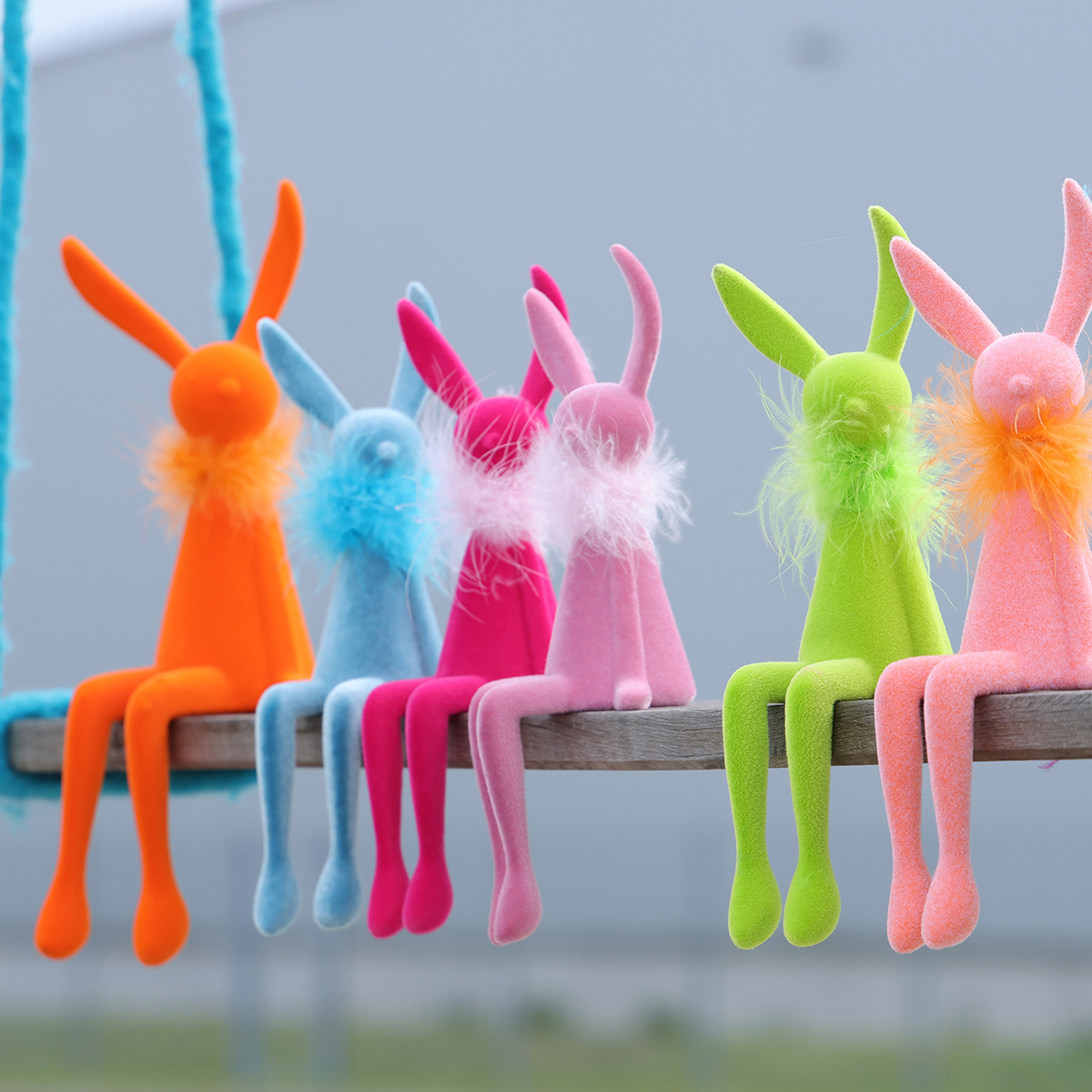 Our Easter bunny decorations impress with their successful combination of style and functionality. Their special shelf-sitter shape allows them to sit perfectly on the edge of any horizontal surface with seemingly casually dangling legs, taking up minimal space. They look particularly creative on a sideboard in the living room, a shelf, or even in a spring-themed entryway. The feather boa gives them an elegant yet playfully light look that simply warms the heart.