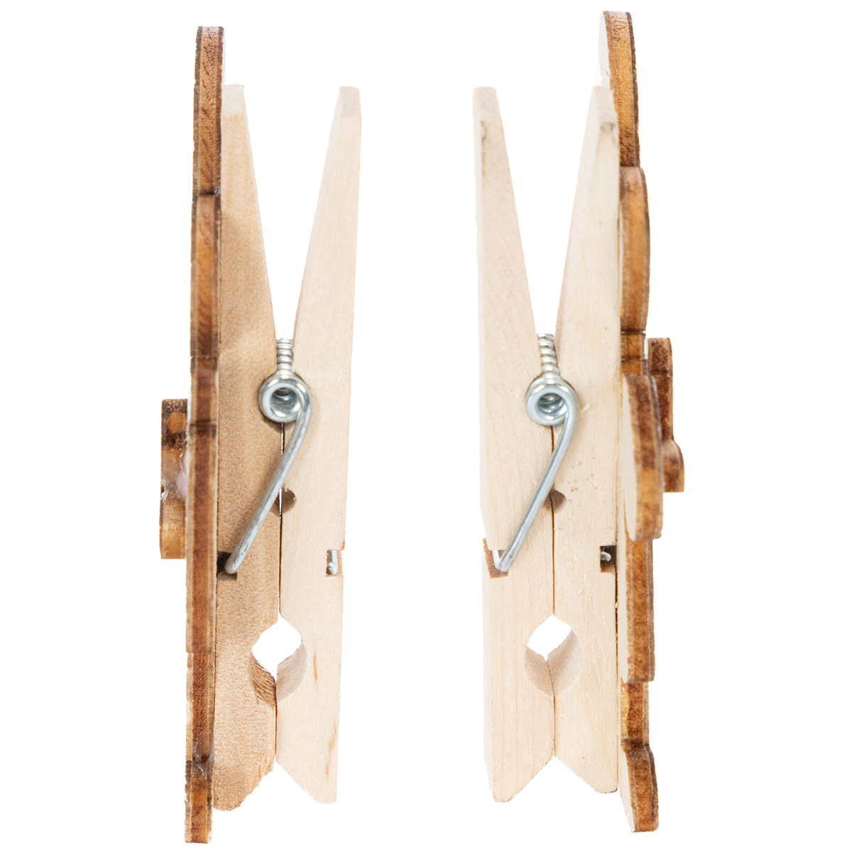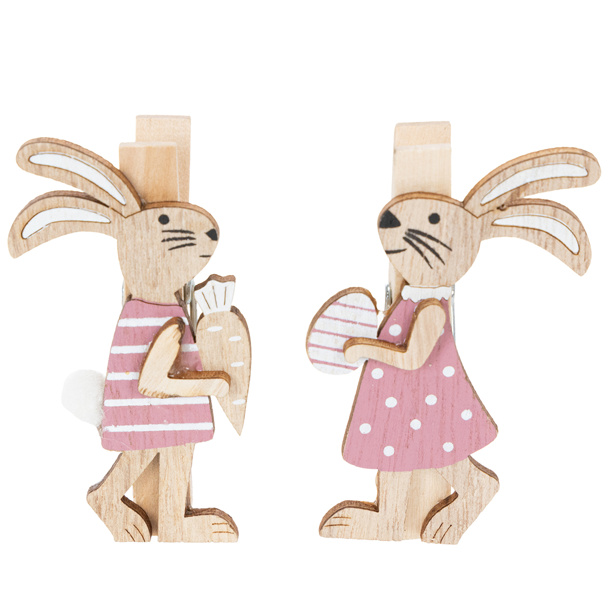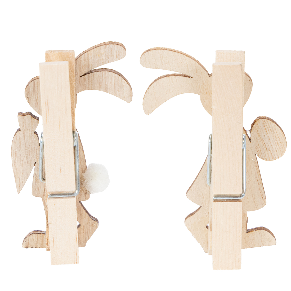 The small decorative wooden pegs as bunnies are available in an assorted set of 4 pieces: two boys and two girls. Each decorative clip is approximately 7.5 centimeters high.
