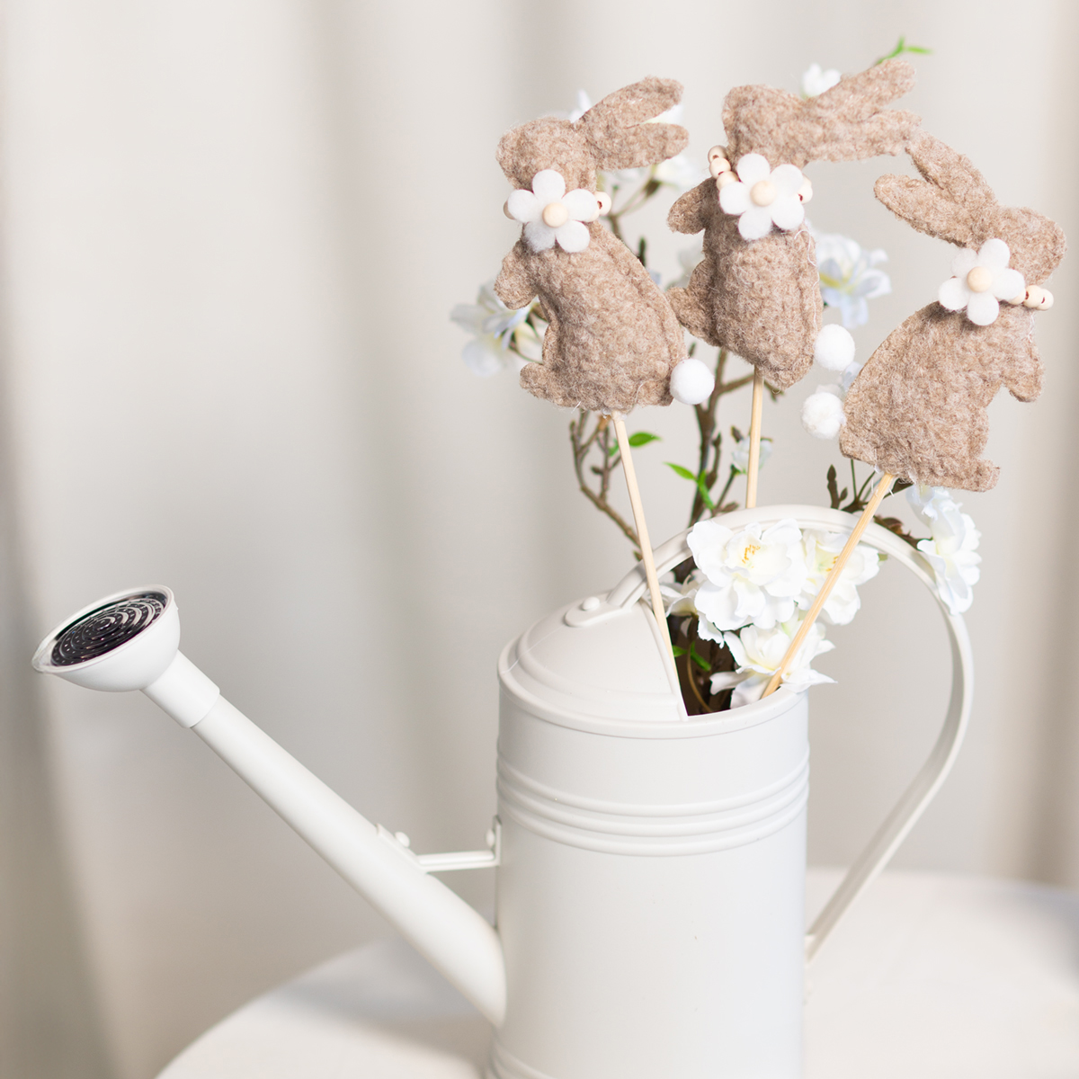This Easter bunny decoration is a true highlight for creative decorating enthusiasts. The figures are made of high-quality felt in a warm brown tone that exudes naturalness and coziness. The charming details, such as the delicate flower and the small fluffy tail, give the bunnies a special appeal. The sturdy stick makes it easy to arrange the bunnies in vases, planted pots, or floral arrangements. Those who prefer minimalist or Scandinavian designs will love the understated yet expressive style of these figures.