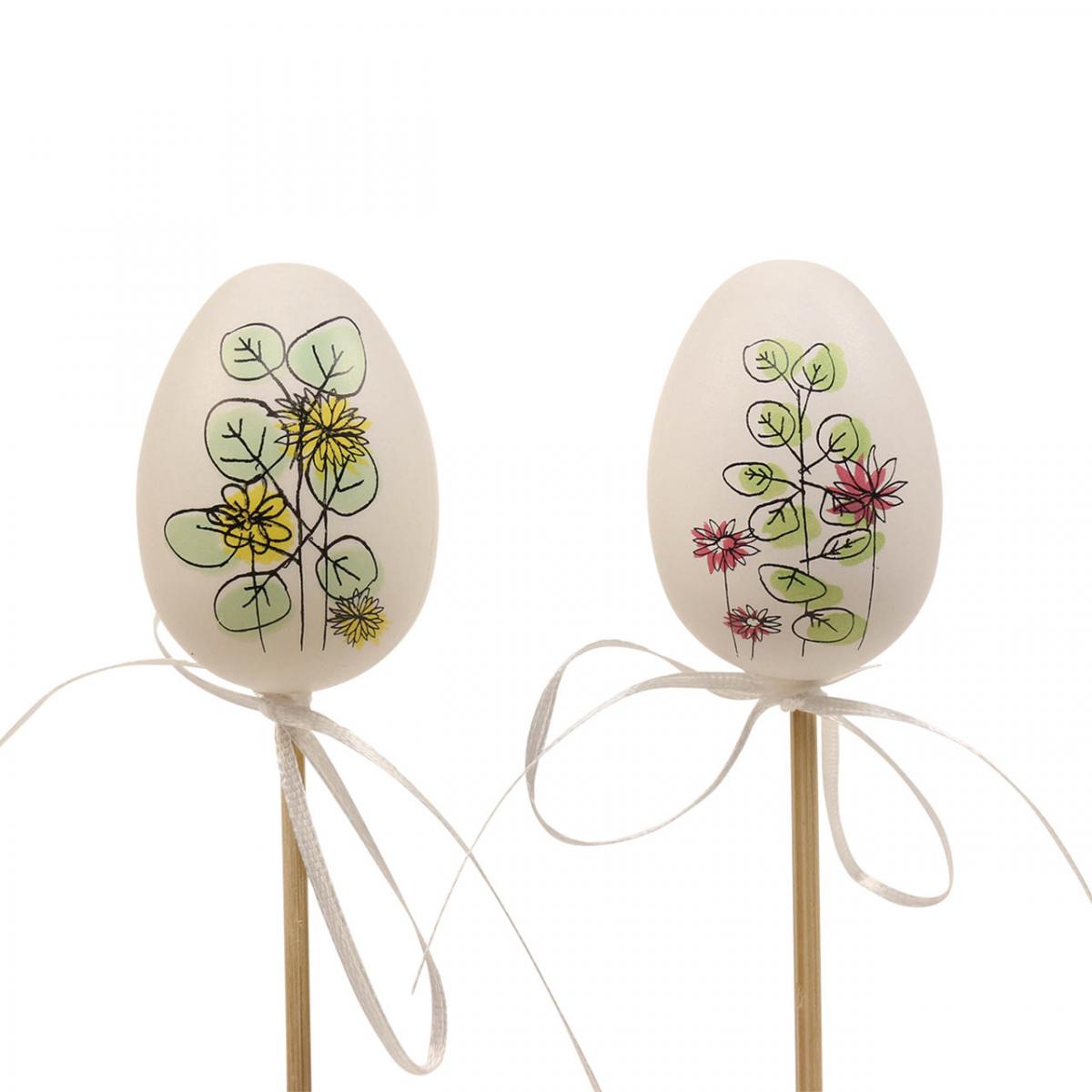 The white eggs feature variegated foliage and floral motifs in shades of green, red, and yellow. Each Easter egg is attached to a wooden stick and can be used to decorate bouquets and Easter arrangements. Thanks to the pointed end, you can effortlessly insert the plant plugs into floral foam, polystyrene or potting soil.