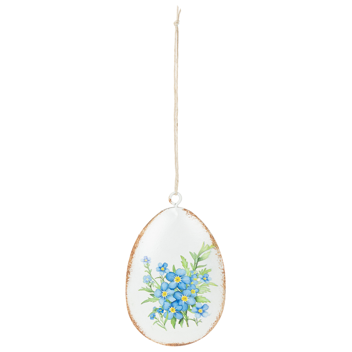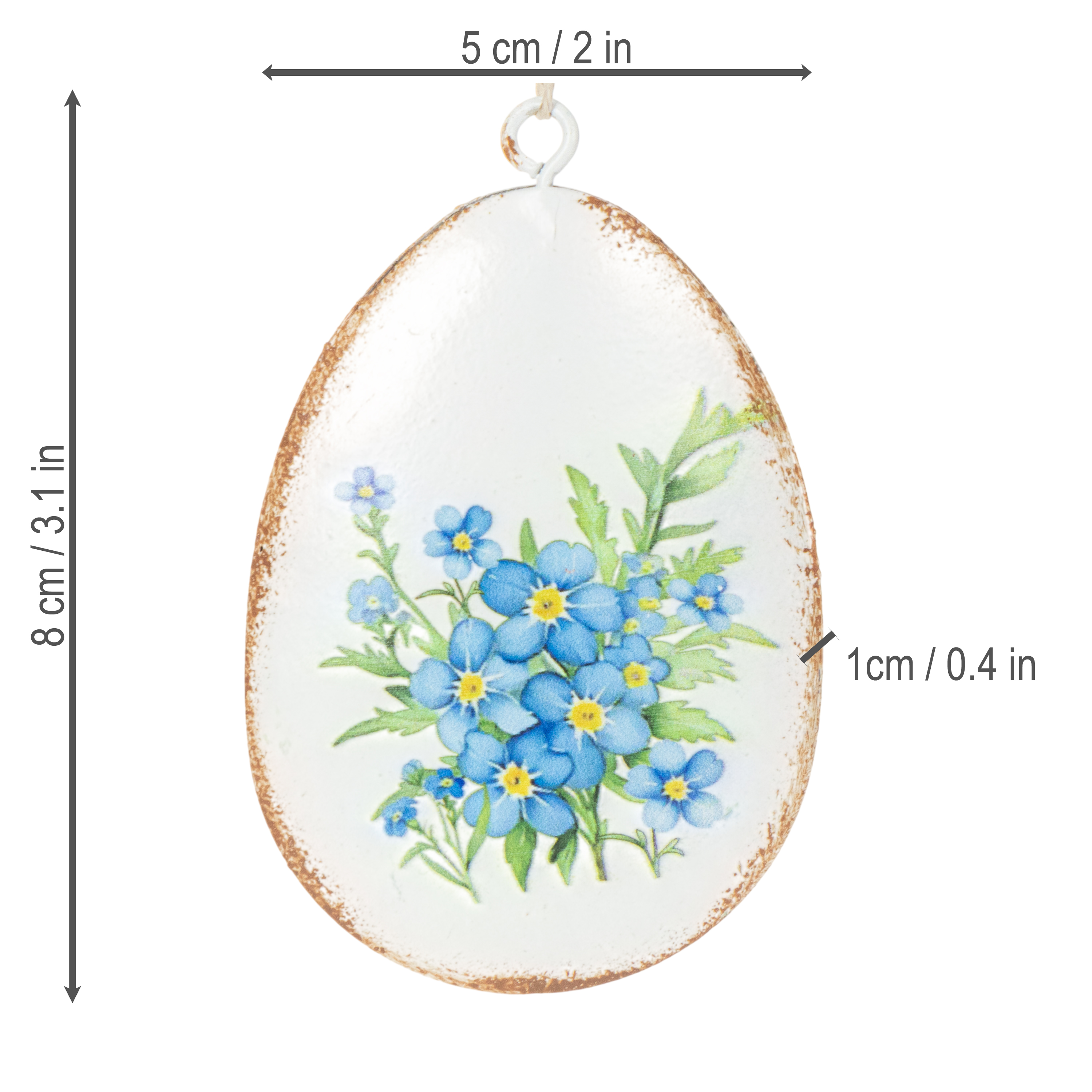 These decorative metal Easter eggs impress with their size and appearance. Measuring 8 cm in height and 5 cm in diameter, they are the perfect size for a variety of uses. The slightly matte white base is complemented by four different floral motifs that bring spring to life: from delicate forget-me-nots to vibrant daffodils. Their subtle vintage look makes them particularly tasteful and a perfect match for retro, shabby chic, or country-style decorations.
