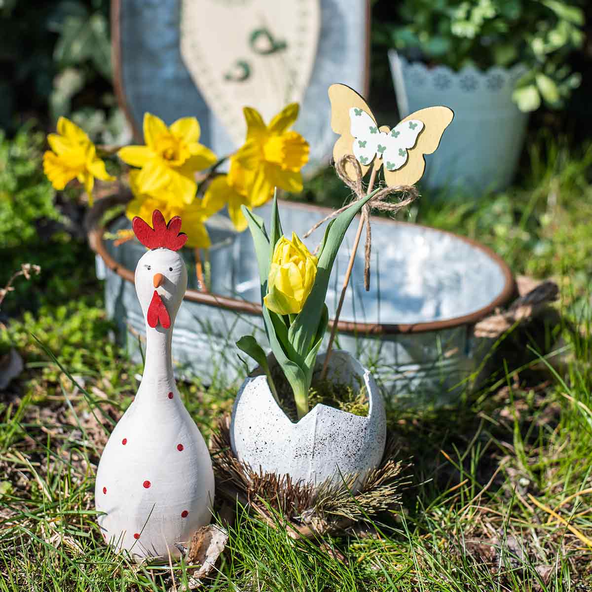 Thanks to the large opening, you can also clothe the decorative egg excellently and then decorate it with a plush bunny, colorful straw and chenille chicks. But this Easter egg can also be used as the basis for an Easter arrangement. And when it is decorated, the plastic egg cuts a fine figure on a windowsill, a dining table or a wall shelf. Of course, the egg decoration can also be used for floral Easter greetings, which you can then hand over as part of a flower arrangement.