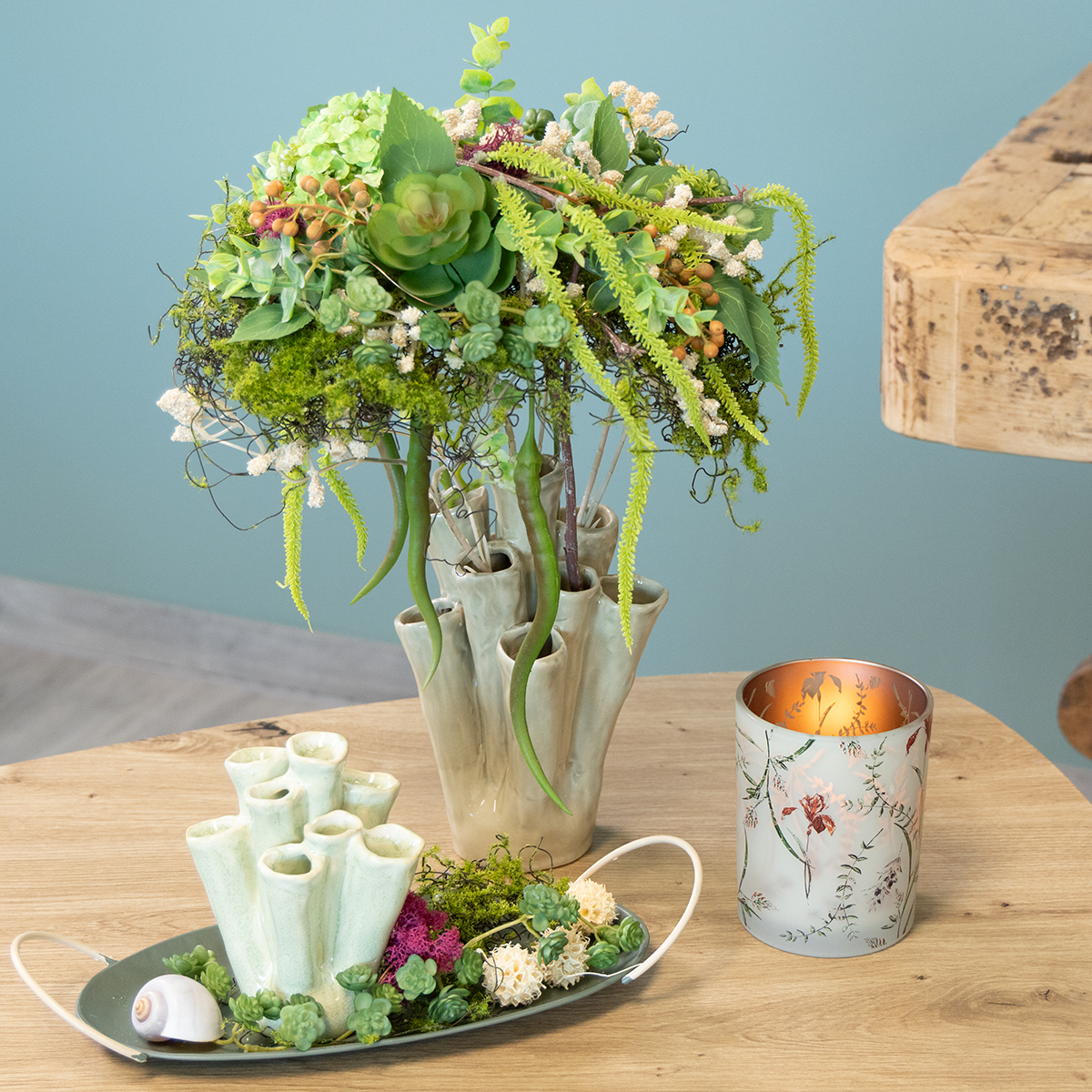 This elegant floral-design candle holder is more than just a simple piece – it's a real eye-catcher! The delicate plant pattern in beige tones is reminiscent of soft watercolor paintings, giving the candle holder a natural yet sophisticated character. The metallic-coated inner rim reflects the candlelight in a way that creates a captivating ambiance. Simply magical for cozy evenings in the living room or on the patio!