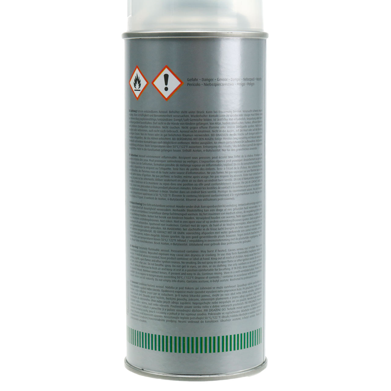Ingredients: Acetone, n-butyl acetate, 2-methoxy-1-methylethyl acetate, propane, butane, isobutane, ethanol, 2-propanol, titanium dioxide, xylene.