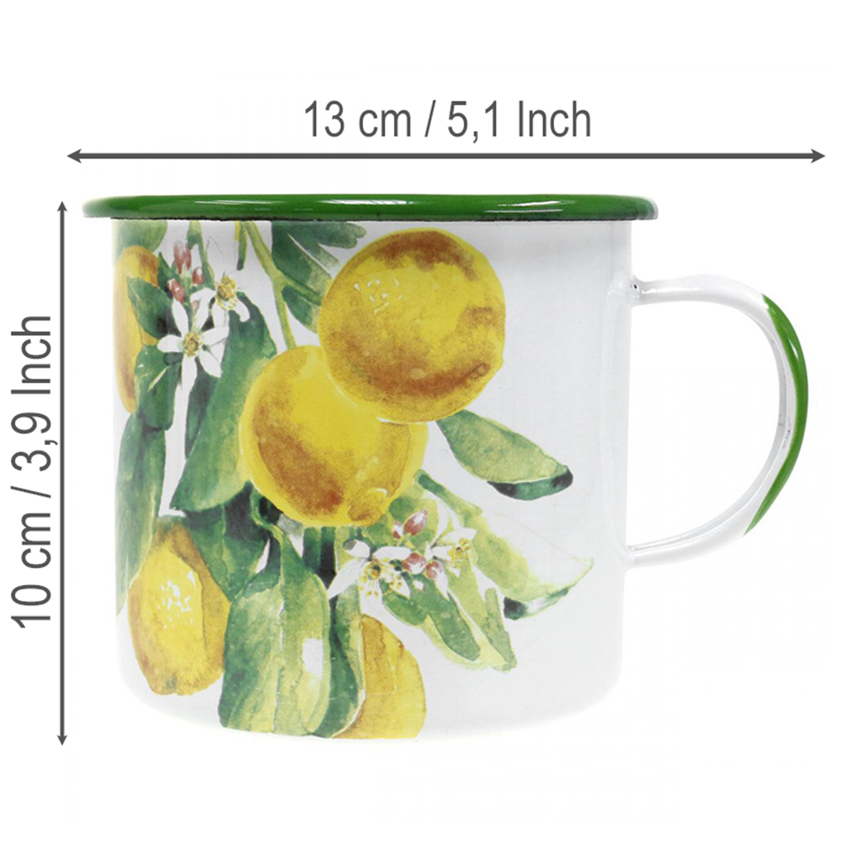 The cup for planting is made of metal, which has been enamelled. The planter is decorated on both sides with a lemon motif made of fruit, blossoms and foliage. – The background, inside and handle of the planter are kept white. A green stripe adorns the opening and the handle.