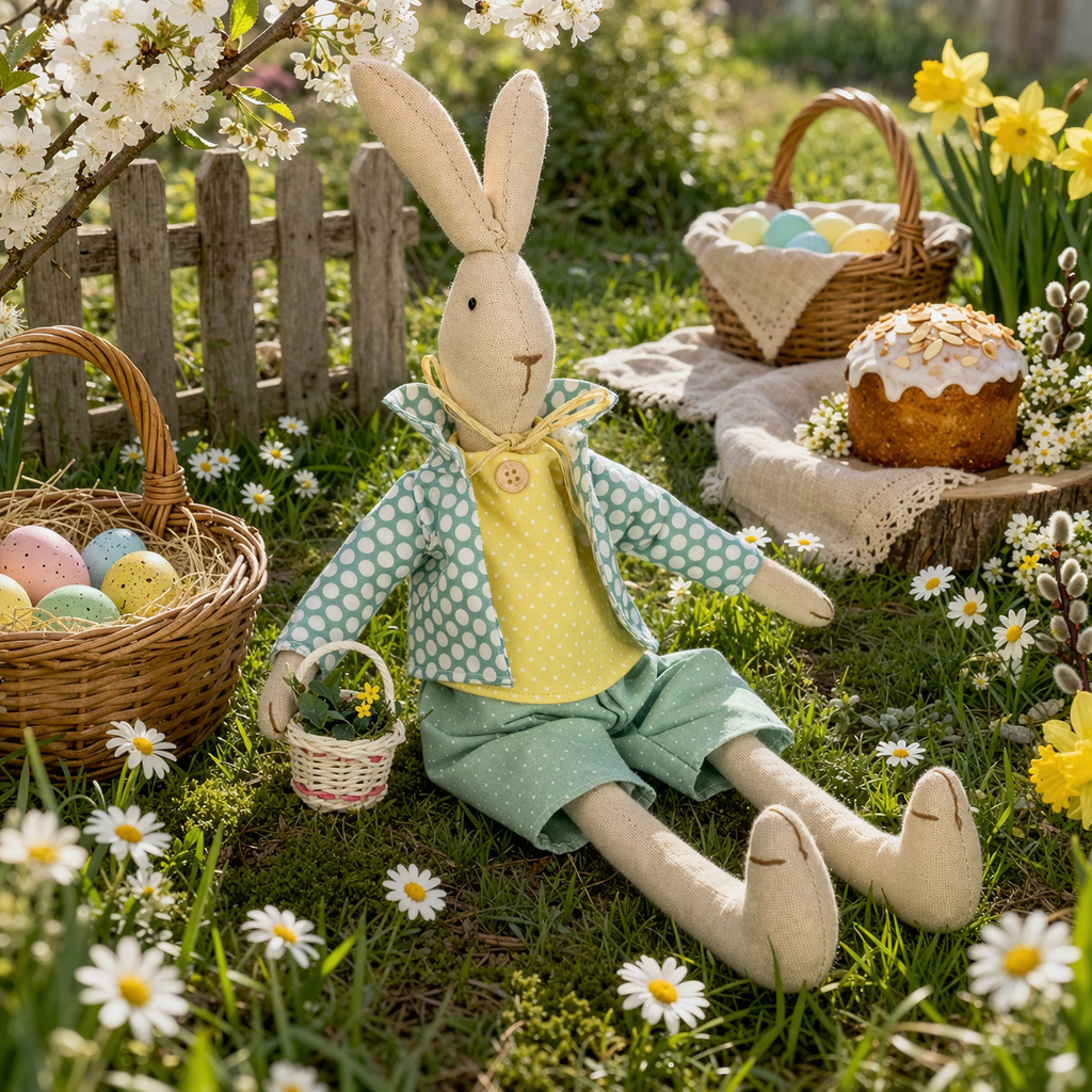 Fabric Easter bunnies like this cute bunny with clothes make a wonderful Easter decoration!