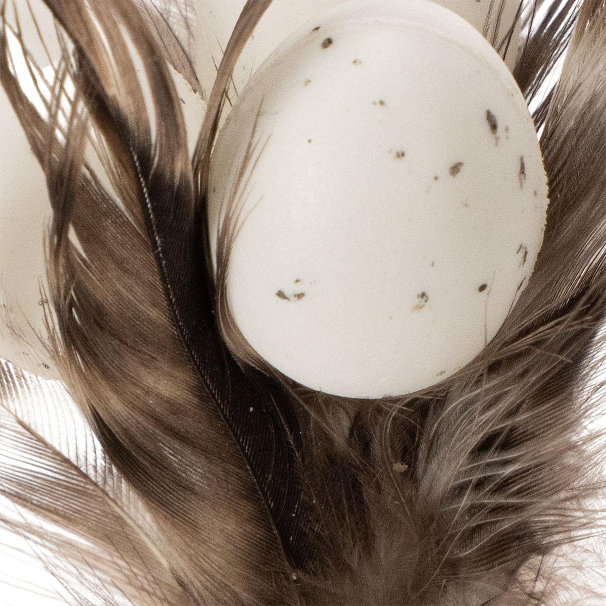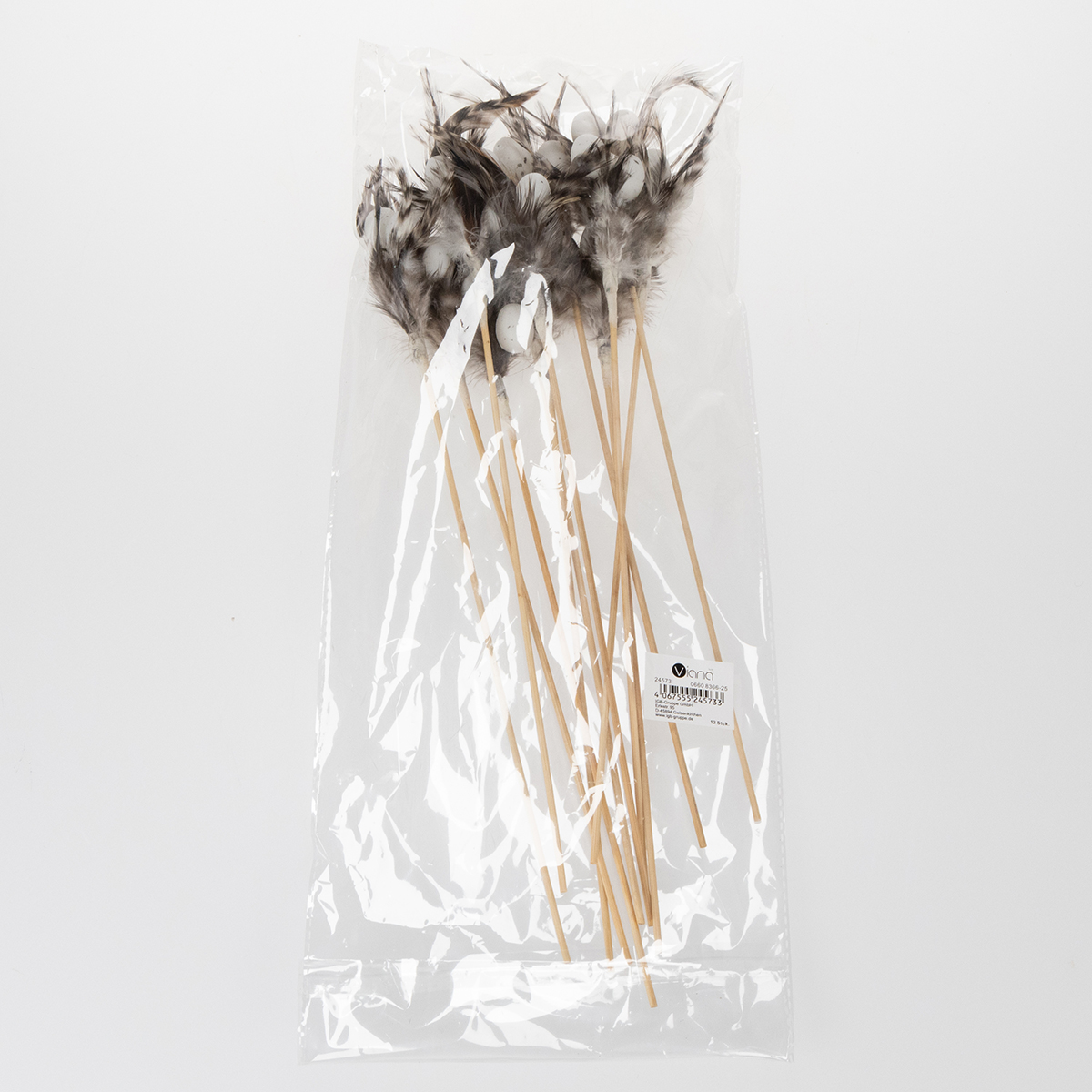 - Material: Wooden stick with natural feathers and small plastic eggs