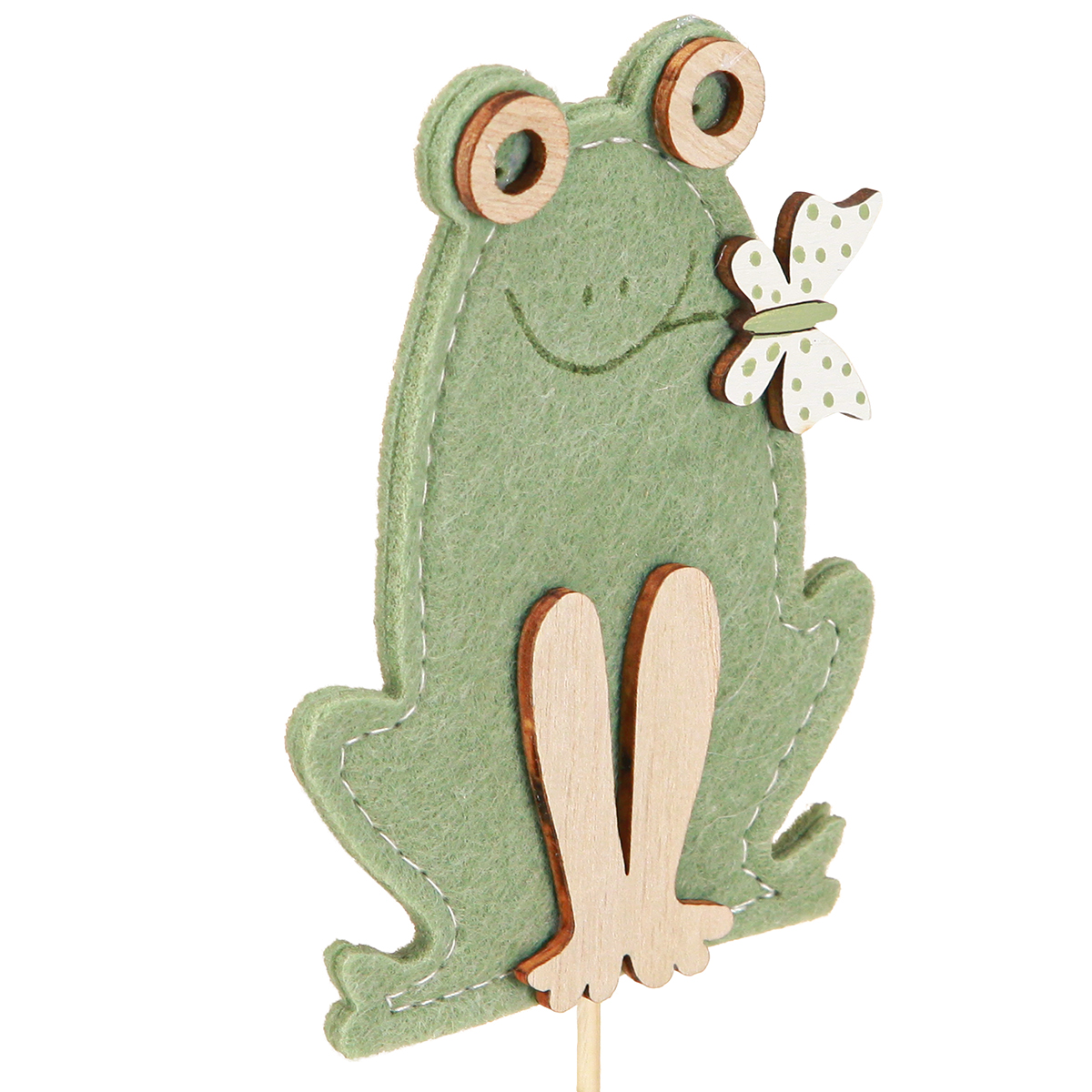 Decorate your garden or balcony with the charming 12 flower plugs, which consist of cheerful frogs in two different designs. These frog figures are made of high-quality felt and decorated with wood, which ensures a seasonal combination of natural materials. The green frogs playfully carry small accessories, such as a butterfly and a pink flower, which create a colorful and lively atmosphere. This style is ideal for a modern and Scandinavian-inspired interior design character. Whether large or small planters, these wooden plugs always set a colorful and creative accent. With their cheerful appearance, they reflect the lightness and freshness of spring and summer. They harmonize particularly well with other cheerful figures from the animal world, such as butterflies or birds, which you can also find at Floristik24. Combine this colorful decoration with your spring or summer flowers and conjure up a cheerful ambience that will delight friends and family alike.