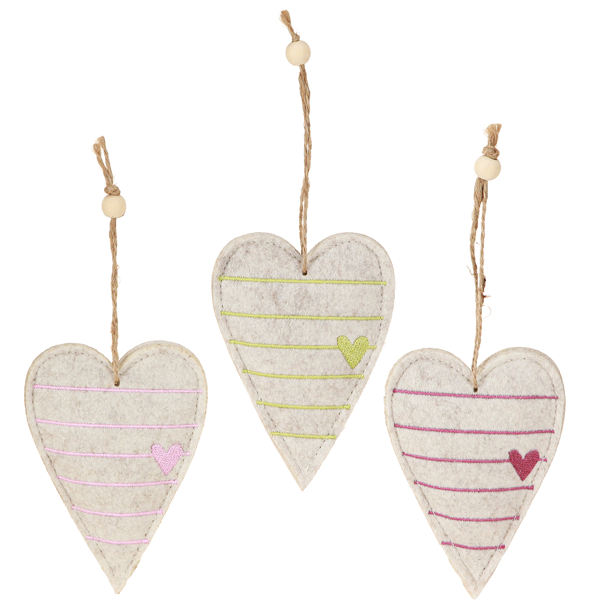 The felt hearts in grey are a standout element for your spring and seasonal decorations. This heart decoration consists of six carefully crafted felt hearts in light grey and 3 different neon colours for artistic details. Each heart is decorated with colour-coordinated stripes and a lovingly sewn-on heart - in pink, pink and light green - which gives them a fresh and lively look. The felt hearts are ideal for hanging on the Easter bush, Easter arrangement or Easter wreath on the wall or door. Thanks to the integrated jute cord with decorative wooden bead, the hearts can be hung up effortlessly. These stylish decorative hangers in Scandi style perfectly complement your home or party decorations and exude springtime charm.