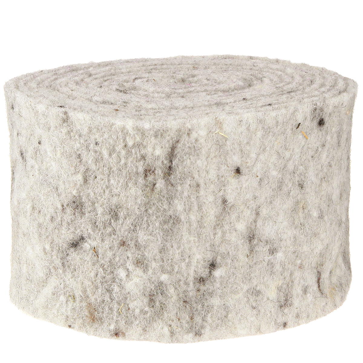 The felt tape in gray is wound into a large roll and has a length of about 5 meters. The width is about 15 centimeters.