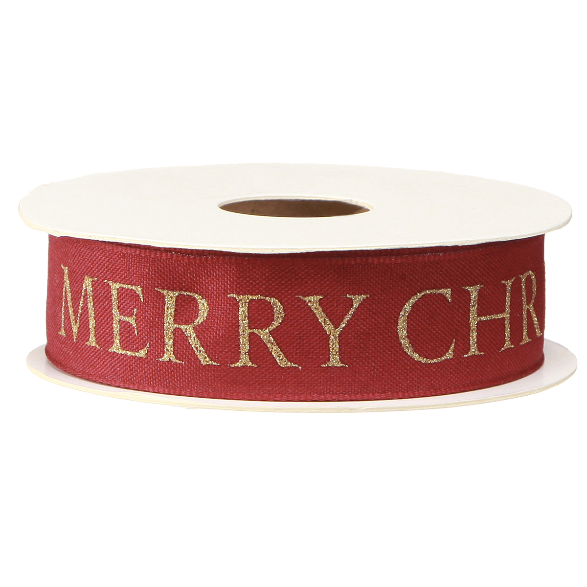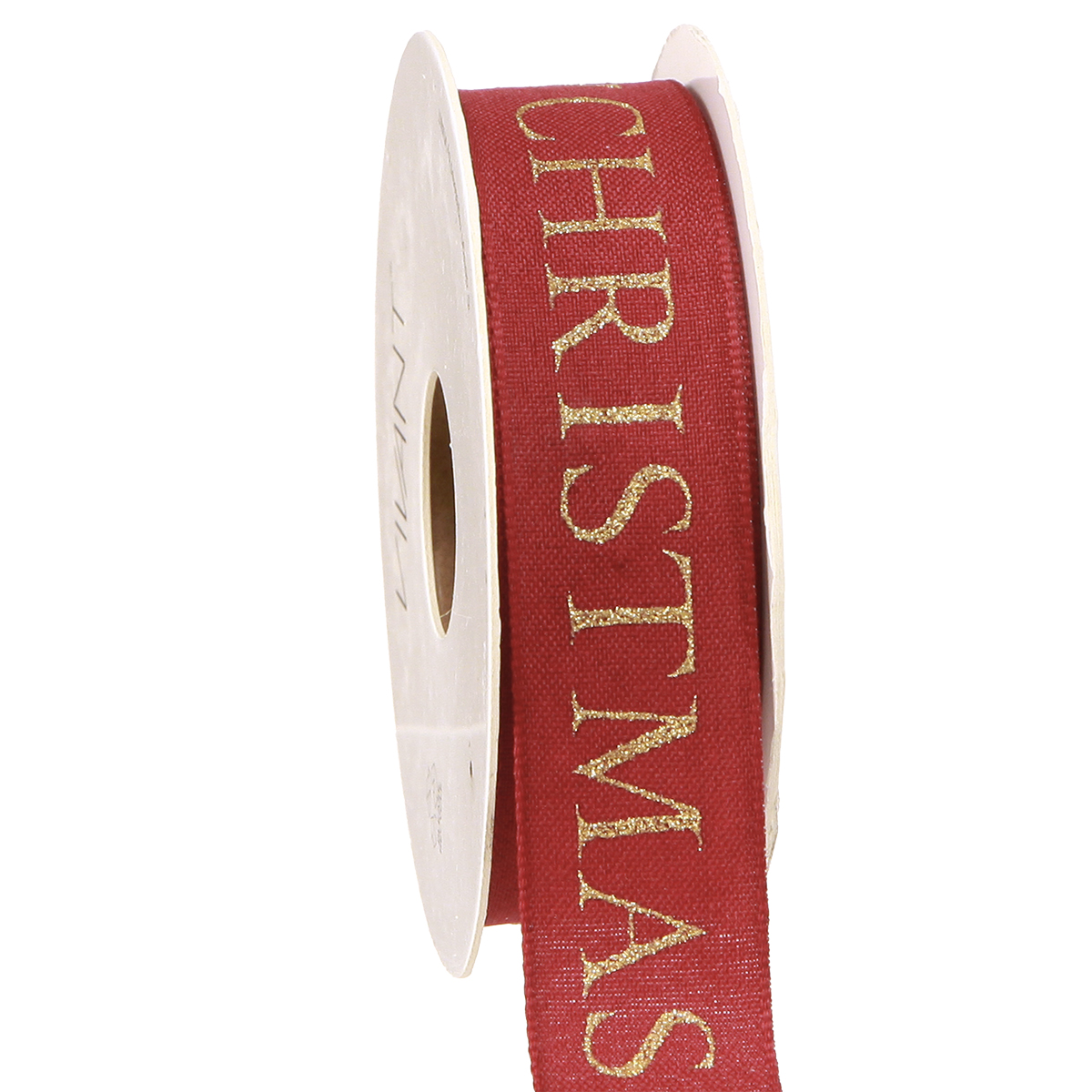Festive Christmas ribbon in red with golden 'Merry Christmas' lettering Width 25mm Length 15m