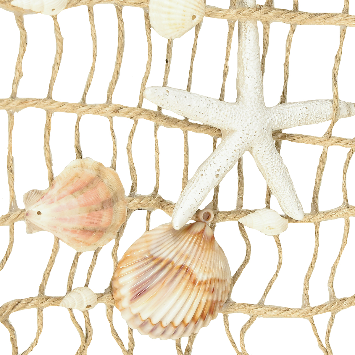 The jute net is suspended between two wooden rods, and long fringes at the bottom create a loose finish to this macramé-like hanging decoration. Artificial seashells, snail shells, and a fake starfish turn the decorative net into a complete nautical decoration!
