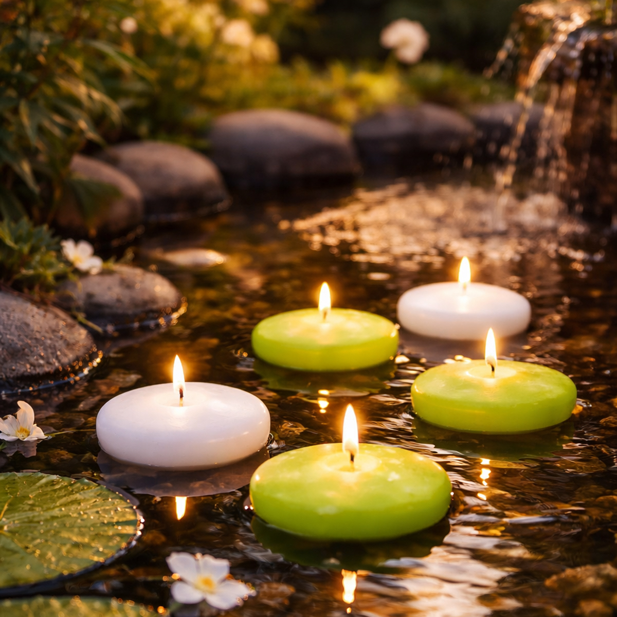 If you're looking to create a cozy atmosphere this summer, these white floating candles are just the thing. Round and flat, they make elegant accents in a garden pond or small lake, bathing the water's surface in a warm glow. Among water lilies, reeds, and other aquatic plants, these high-quality wax floating candles create an almost magical effect, adding a unique ambiance to garden parties and summer gatherings. They're also perfect for pool parties and similar celebrations.