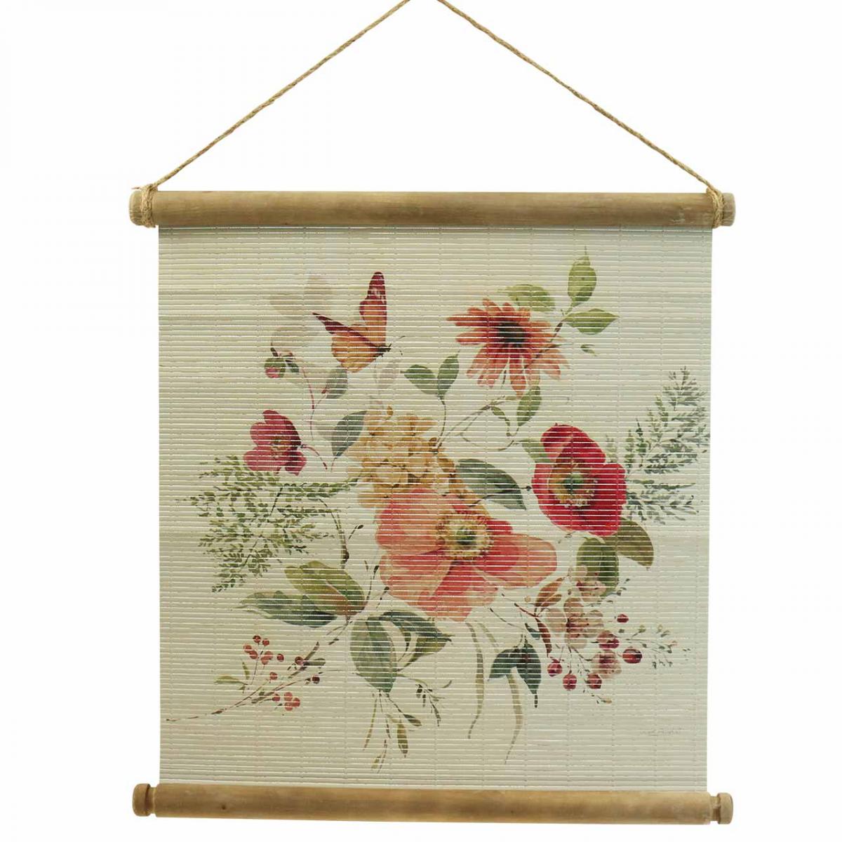 The decorative picture consists of a filigree bamboo mat that is clamped into two wooden sticks. The mural features blooming flowers in aesthetic watercolors and green shrubs and leaves, as well as a butterfly.