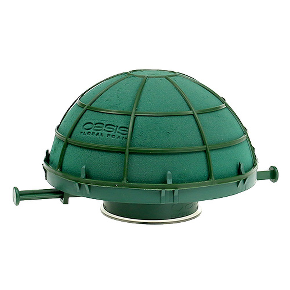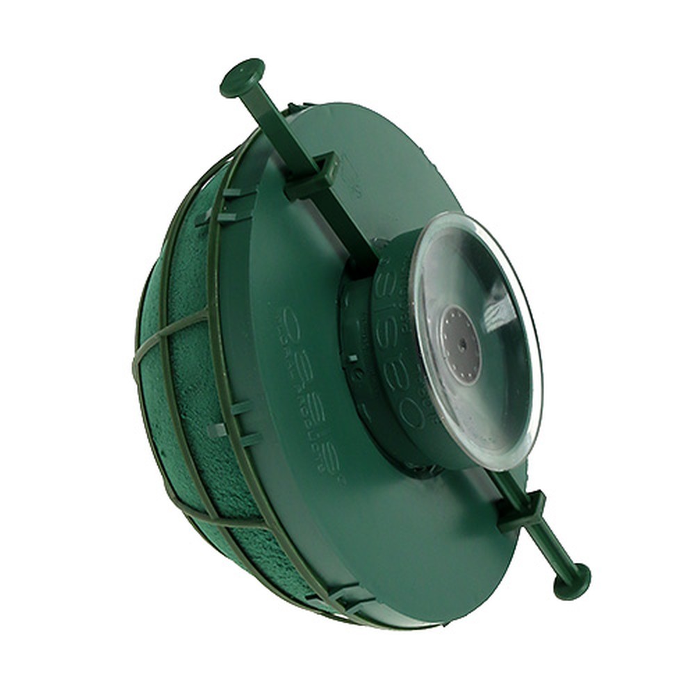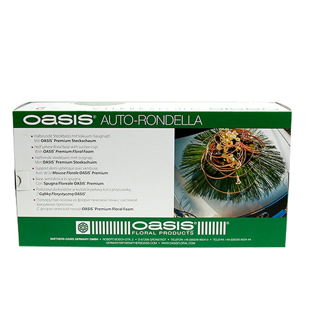 The OASIS® Auto Rondella has a diameter of around 20 centimeters. The height measures about 13 centimeters. The plug-in-mass hemisphere is available in a practical set of 2. An IDEAL ball made of plug moss is already built into every Rondella. This can also be removed if necessary. The same applies to the suction cup device on the underside. Simply press the two accesses inwards again and lift off the hemisphere. You can also attach the arrangement to a glass table. But it can also be used to decorate slightly sloping surfaces. The whole thing is also very suitable for a wedding celebration on a ship. A non-slip decoration is very important here.
