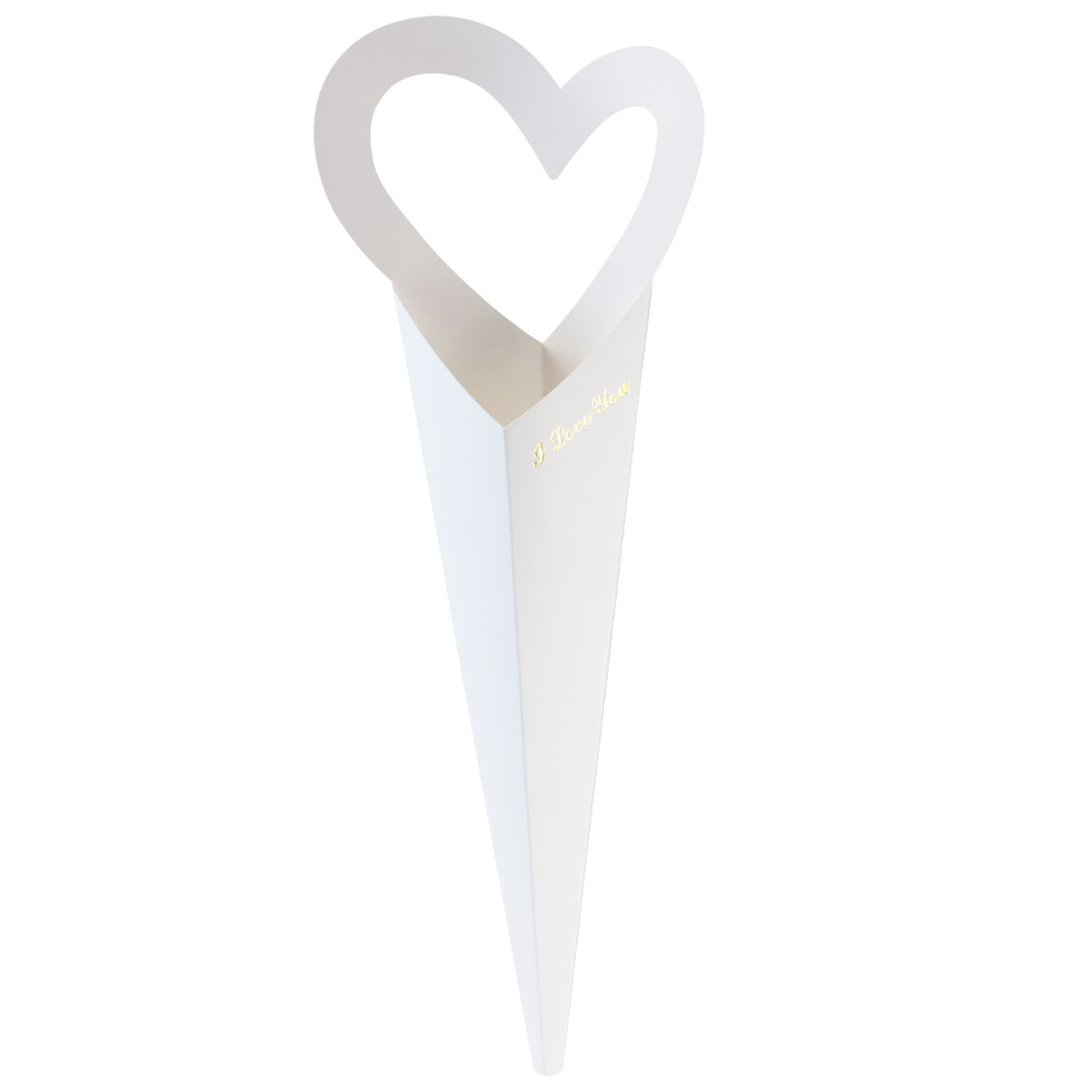 The stylish, white floral packaging offers a strong contrast to red roses and the golden inscription "I Love You" says what's going on in a classy way. The flower bag can be unfolded to create a pointed, inverted cone that provides the perfect support for long-stemmed roses.
