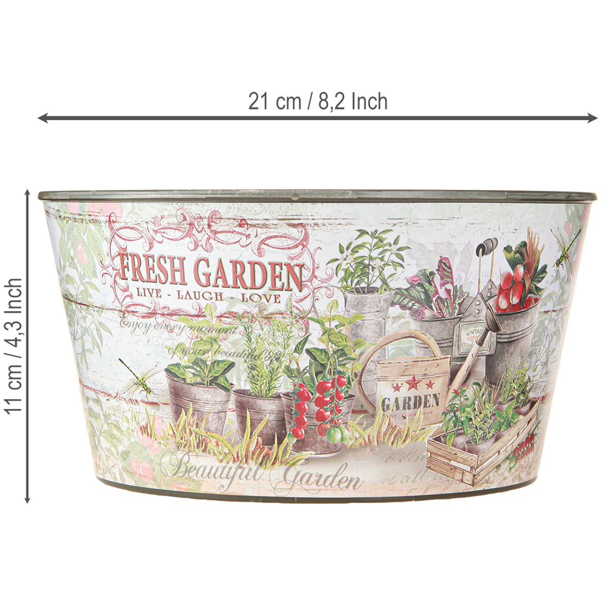 Our vintage-style flower bowl made of high-quality plastic and featuring the "Fresh Garden" lettering is the perfect addition to your outdoor and indoor decor. With a diameter of approximately 21 cm and sold in pairs, these bowls are ideal for lovers of vintage charm. The colorful design, combined with a motif depicting gardening tools, planters, fruit and vegetable plants, and herb pots, brings a spring and summer vibe to your home or garden. The "Fresh Garden – Live – Laugh – Love" lettering features a stylish vintage design and blends harmoniously into your spring or summer table setting. Made of high-quality plastic, this flower bowl not only provides a visual highlight but is also durable and robust. Whether used as a flowerpot, planter, or herb pot, our flower bowls exude an inviting garden and balcony decoration.