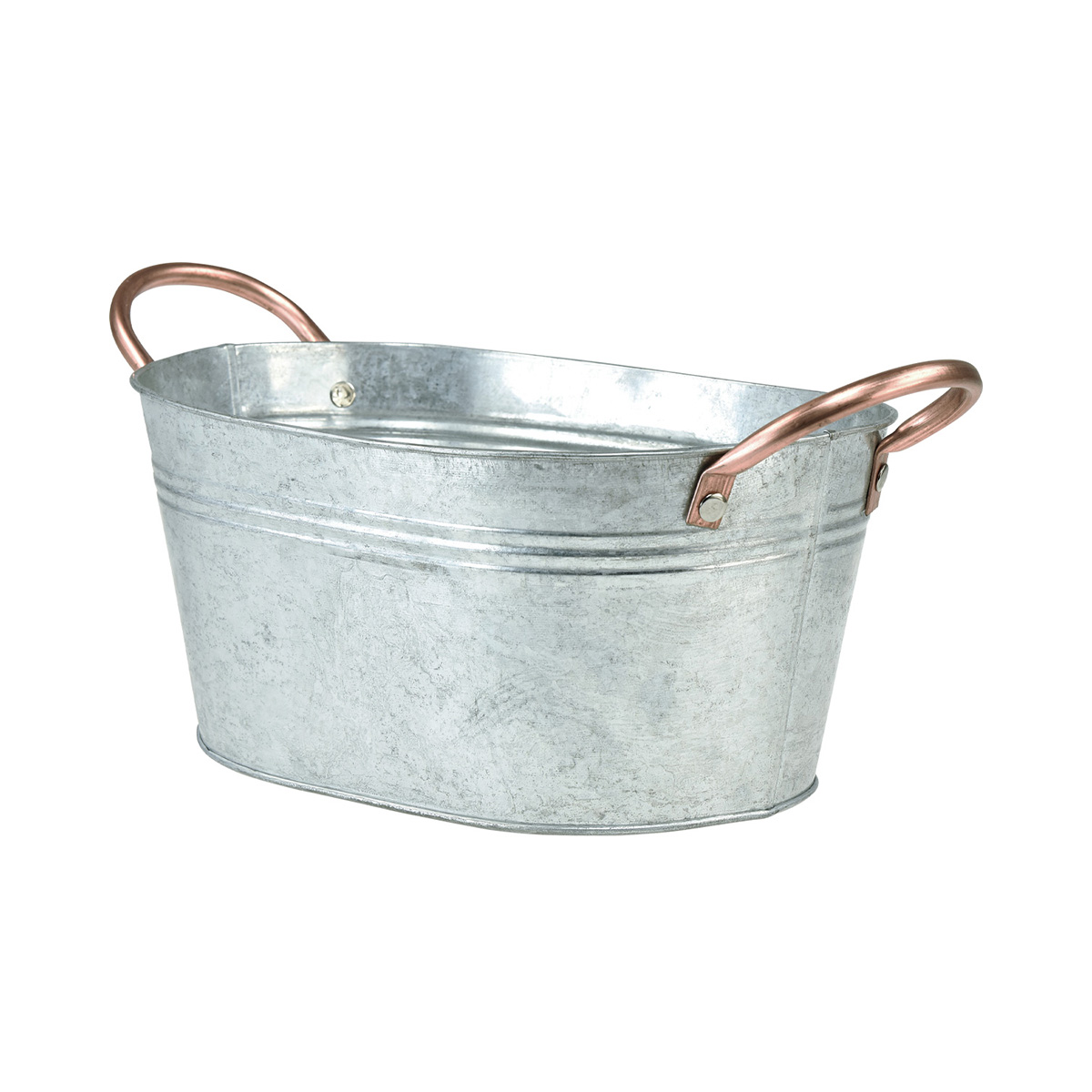 This flower bowl with handles is perfect for miniature plants. Galvanized and silver-colored, the decorative metal bowl is noticeable thanks to the copper handles.