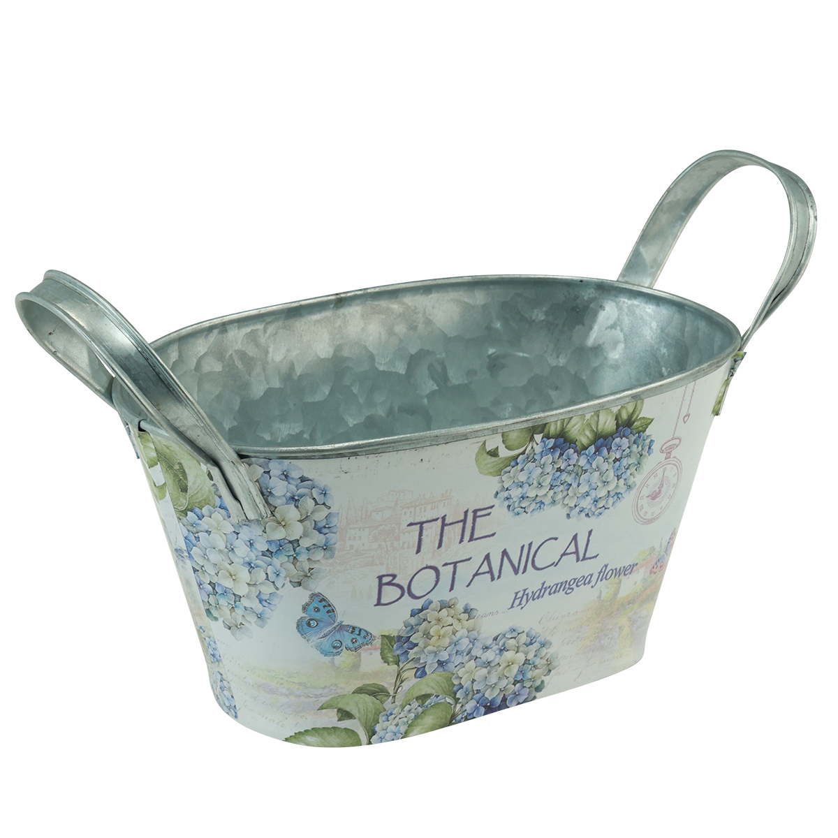The metal flower bowl with handles with its detailed print of blue hydrangeas transports you to a dreamy flower garden.
