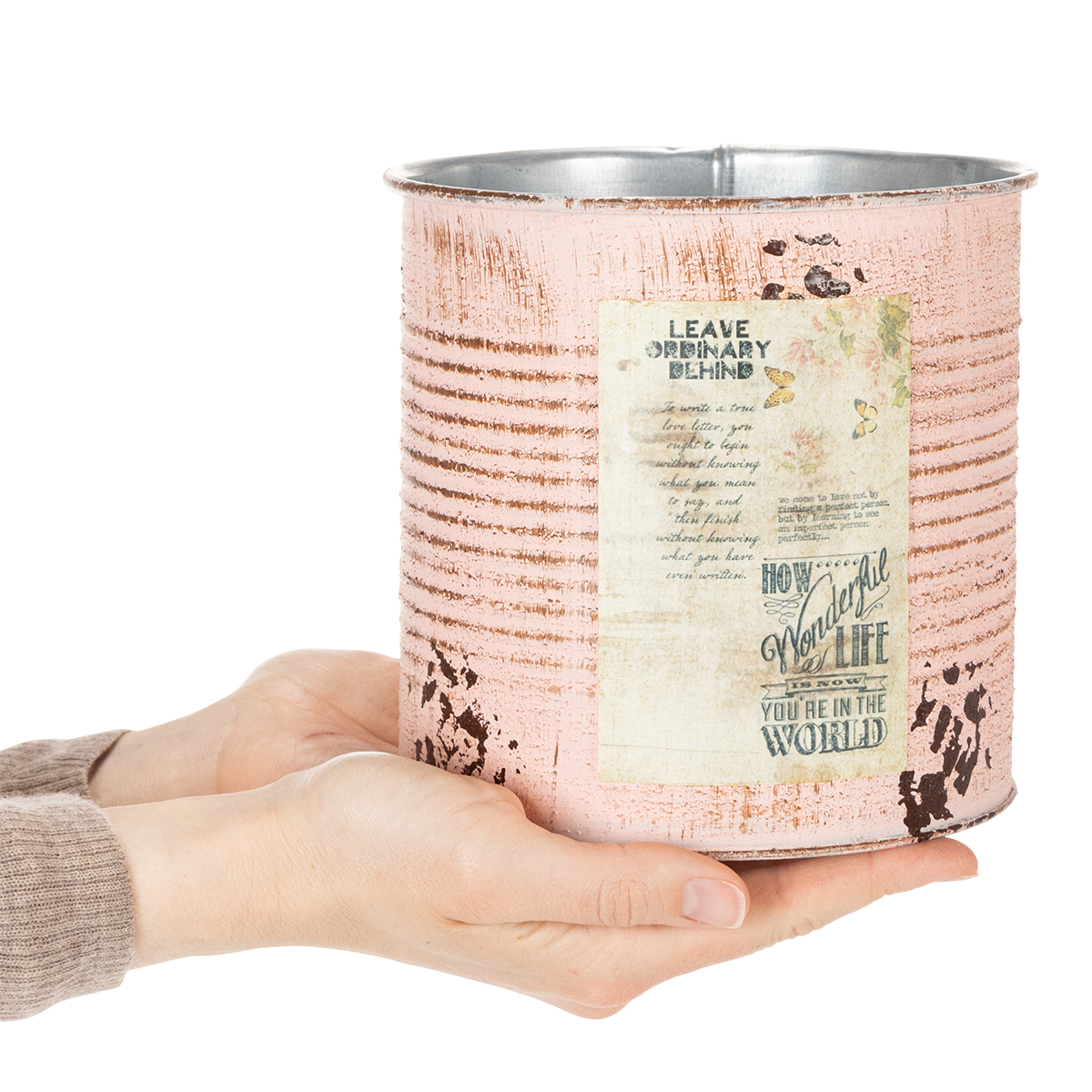 This salmon-colored flower pot from a decorative tin makes the summer colorful! Elaborately painted with rust spray and a selected pastel colour, the metal container can be used as a cachepot or planter. A vintage sticker underlines the refined, nostalgic look of the tin can. The fact that the metal decoration is actually brand new can only be seen from the silver-colored inside. Of course, this box, which is specially made as a planter, has no sharp edges on the inside.