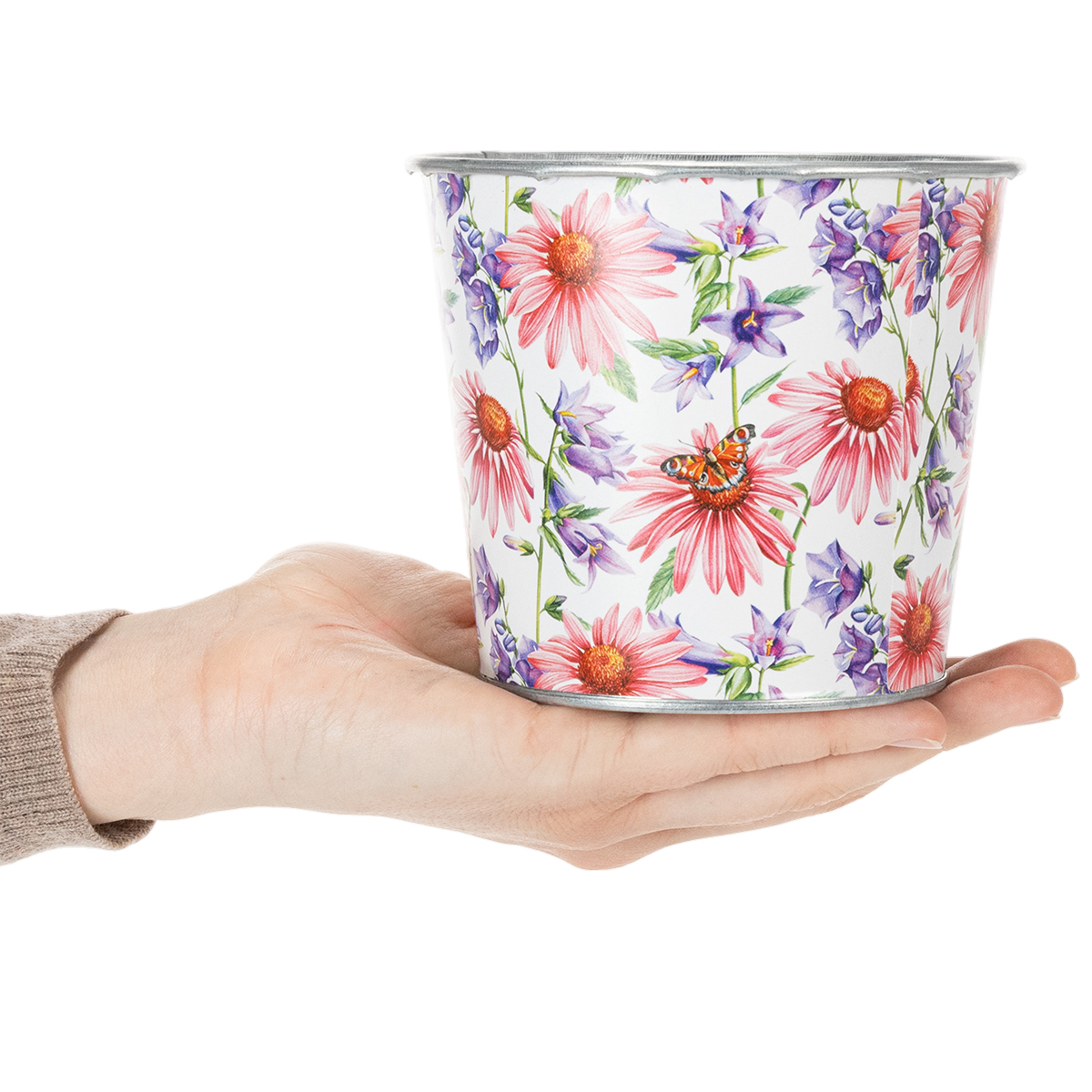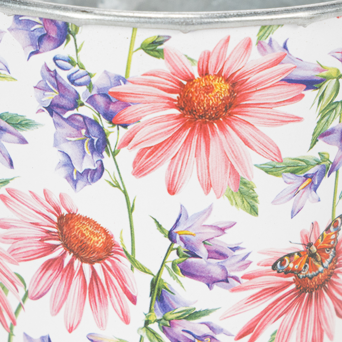 The decorative pot is galvanized on the inside and shimmers silver, while the enchanting sticker with a spring print on a white background can be found on the outside. The pot widens a little towards the top. When planting, it is advisable to line the planter with foil and create a drainage layer of gravel or clay. This means that the moisture does not damage the plant or the planter.