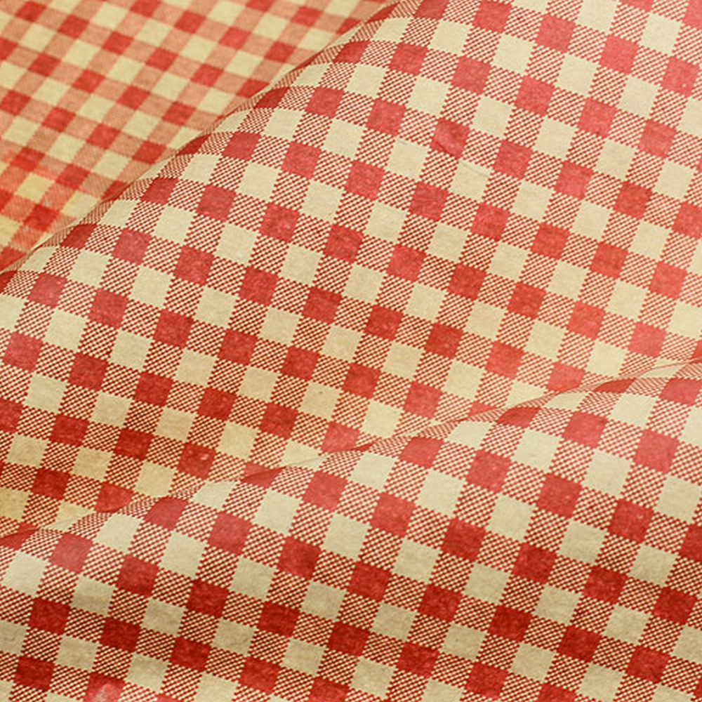 The floral silk with a red check pattern is on a roll with a total weight of 8 kilograms. The wrapping paper has a width of about 75 centimeters. The grammage is between 30 and 35 grams per square meter. The plastic inserts allow it to be attached to a dispenser.