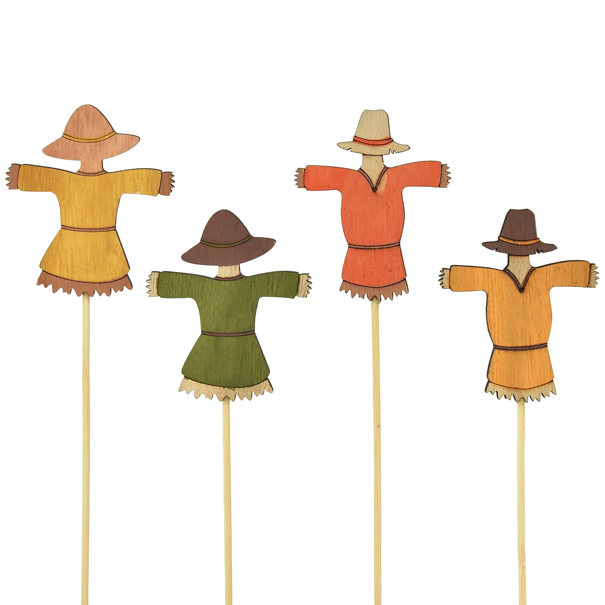 Our lovingly designed flower sticks in the shape of colorful scarecrows are the highlight of every autumn decoration. With a rustic flair, the colorful wooden flower sticks create a warm and inviting atmosphere on any table or in any flower bed. The 12 wooden sticks are sorted by color in four ways and the sharpened wooden sticks make them easy to insert into the soil or into flower arrangements. The one-sided painting with jagged contours that suggest the straw of a scarecrow underlines the natural autumn theme and the vintage design brings a touch of nostalgia to your decoration.