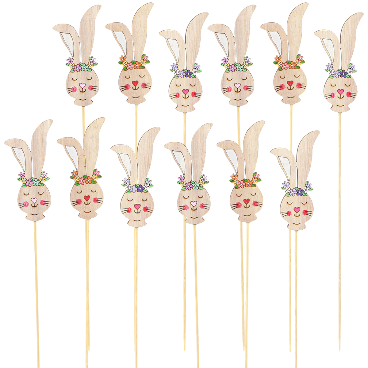 Flower Stick Wooden Decoration Rabbit Head on Stick 11cm 12 Pcs