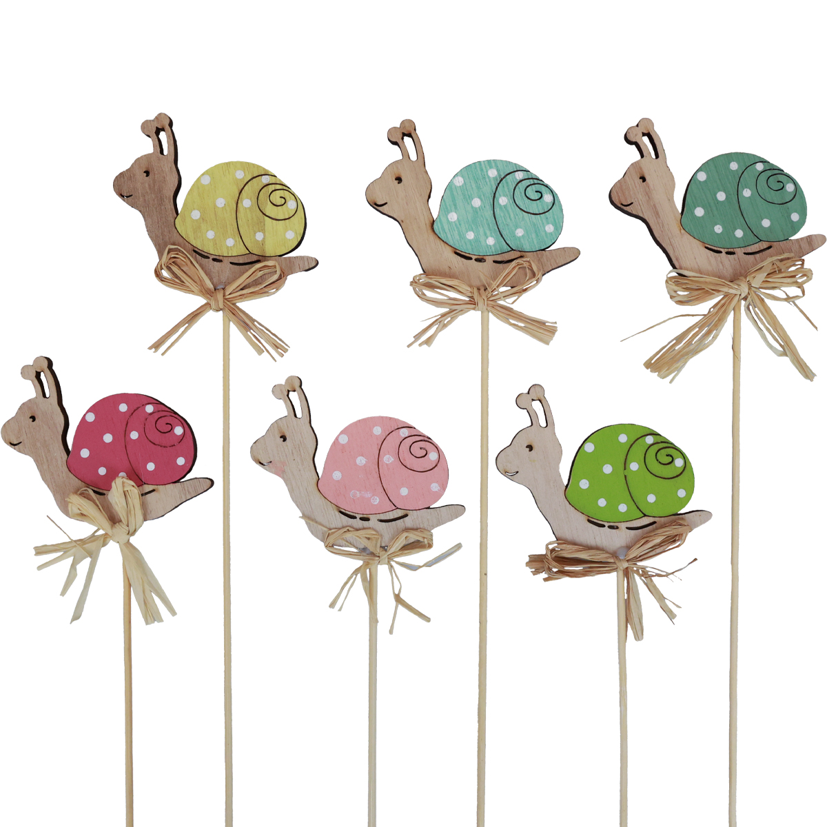 Friendly smile, colored snail shell with white dots and natural wood grain - you will love this decorative plug at first glance. A long wooden stick makes the decorative snails the perfect accessory for bouquets in spring and summer.